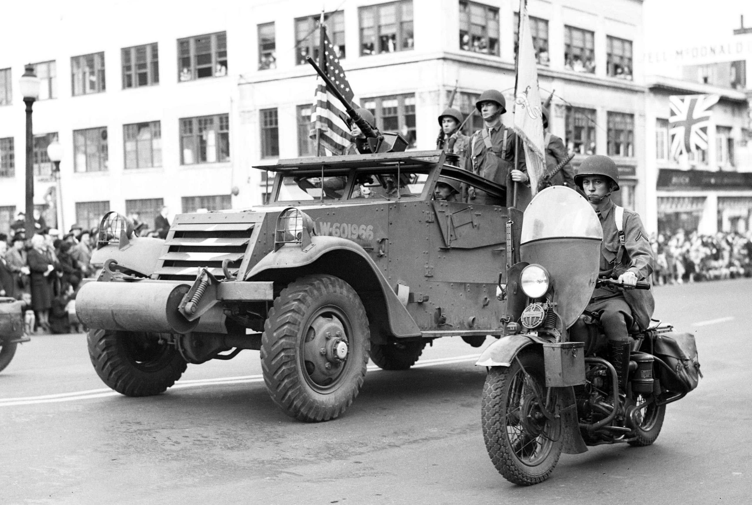 US Army M3 Scout Car, White Motor Company, on parade in Vancouver in 1942. Widely used by Canadian troops during the Second World War, one is preserved in Ontario.