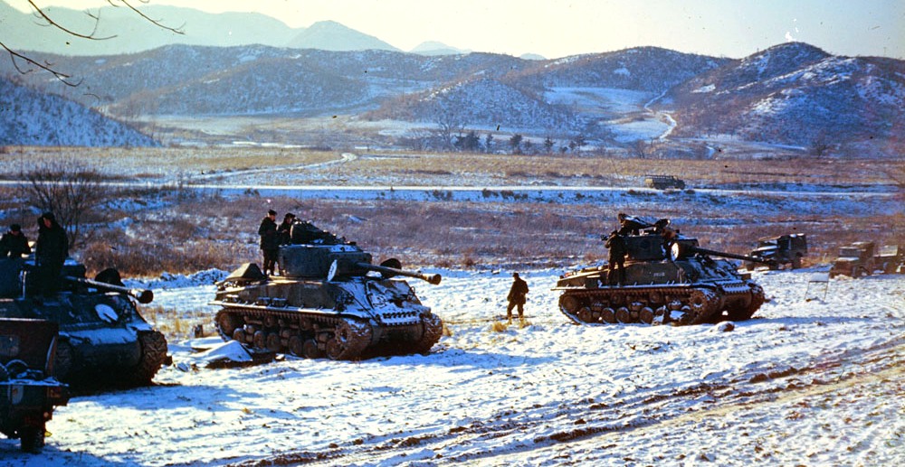 Canadian Medium Tank M4A2(76)W HVSS Sherman “Easy 8” formation in Korea, ca 1952.