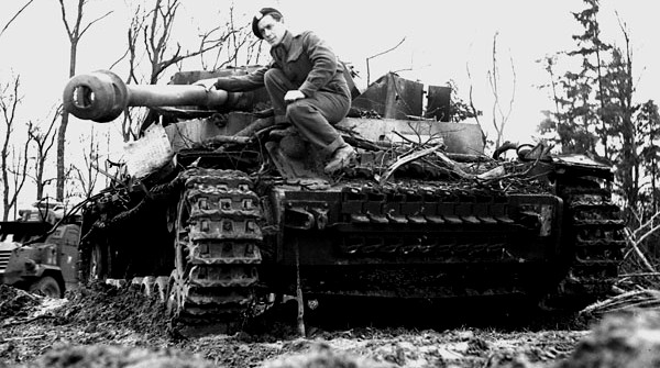 Trooper M.E. Lucy of The South Alberta Regiment examining a German 75mm. self-propelled gun near Xanten, Germany, 7 March 1945.  (Ken Bell, Library and Archives Canada Photo, MIKAN No. 3401784)