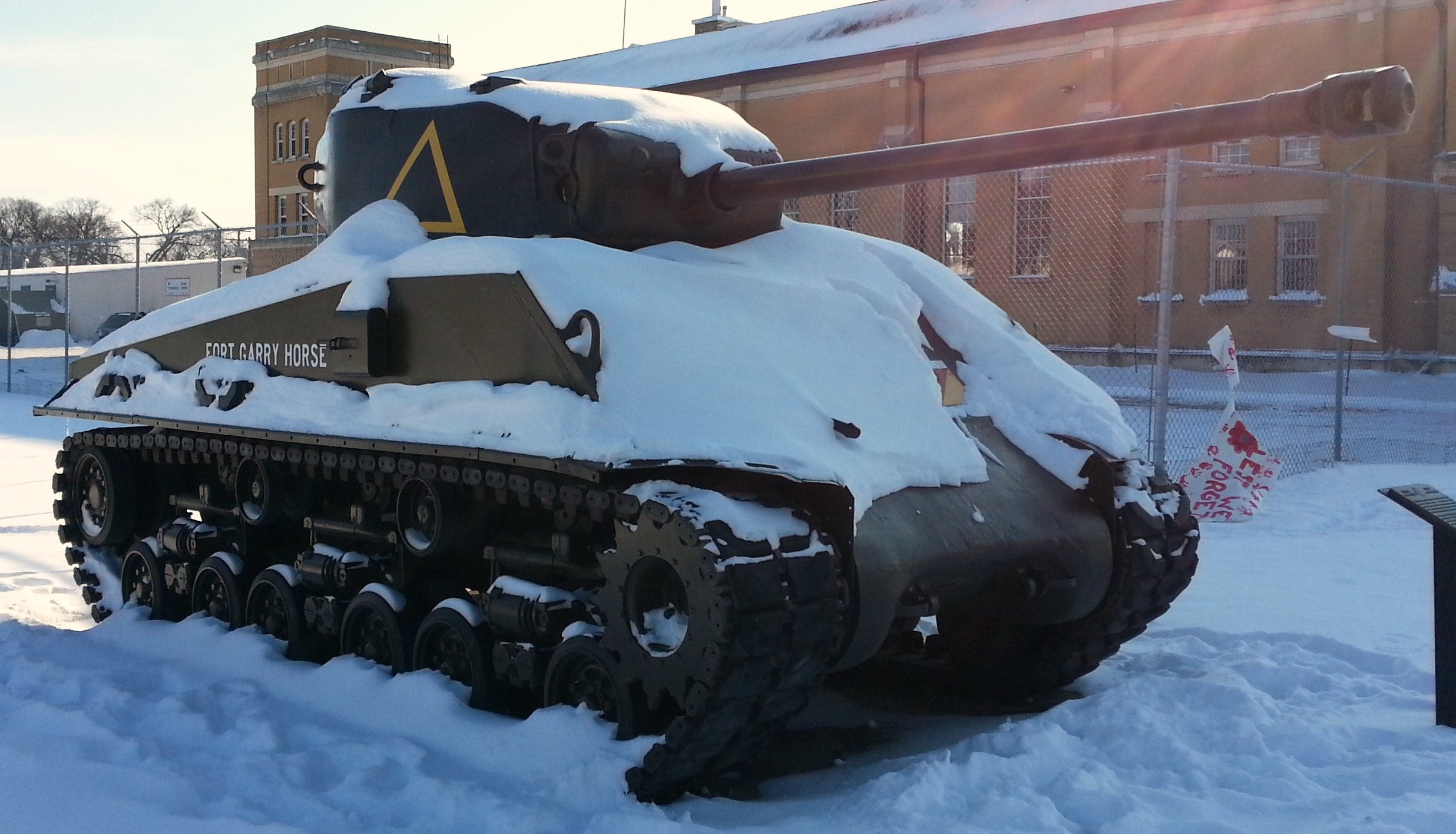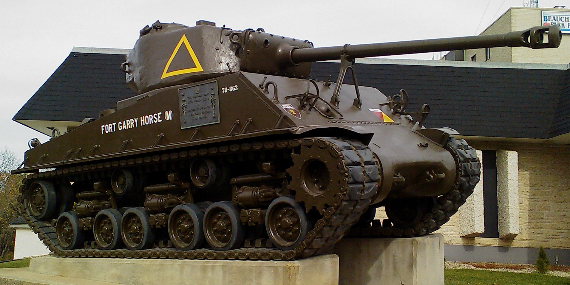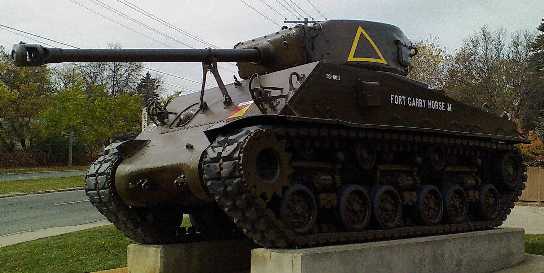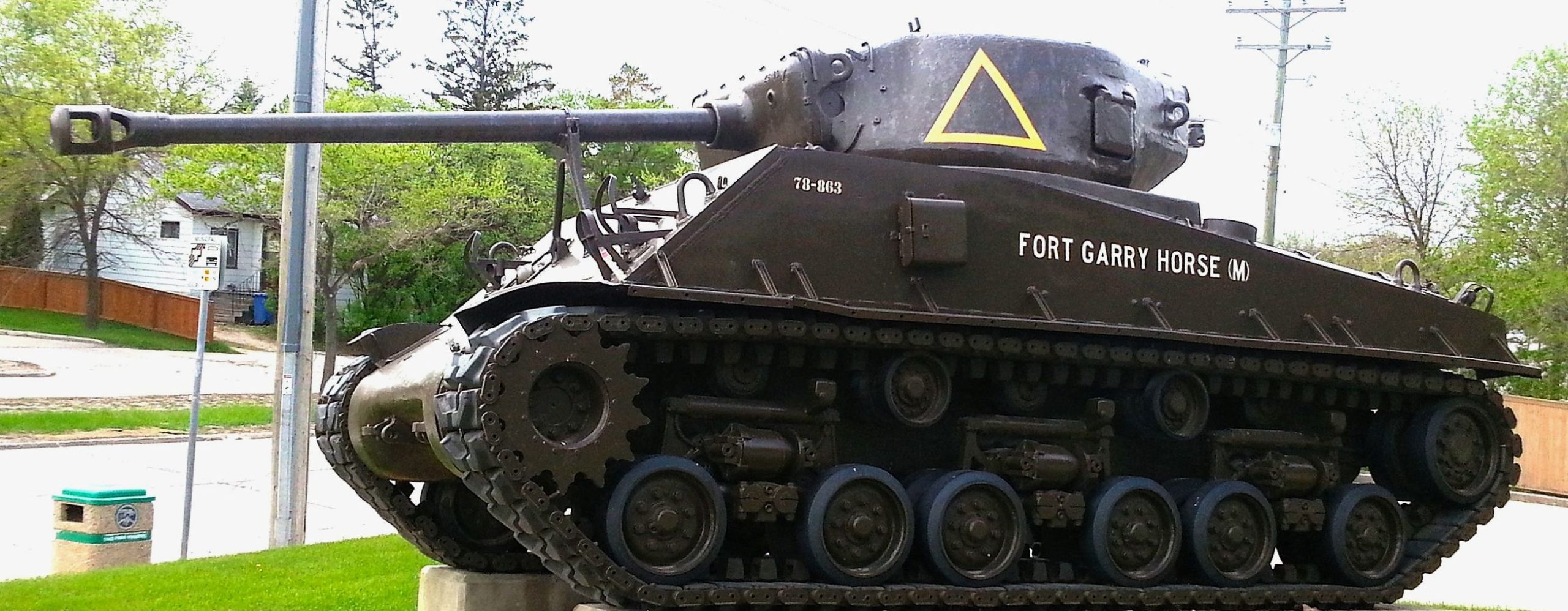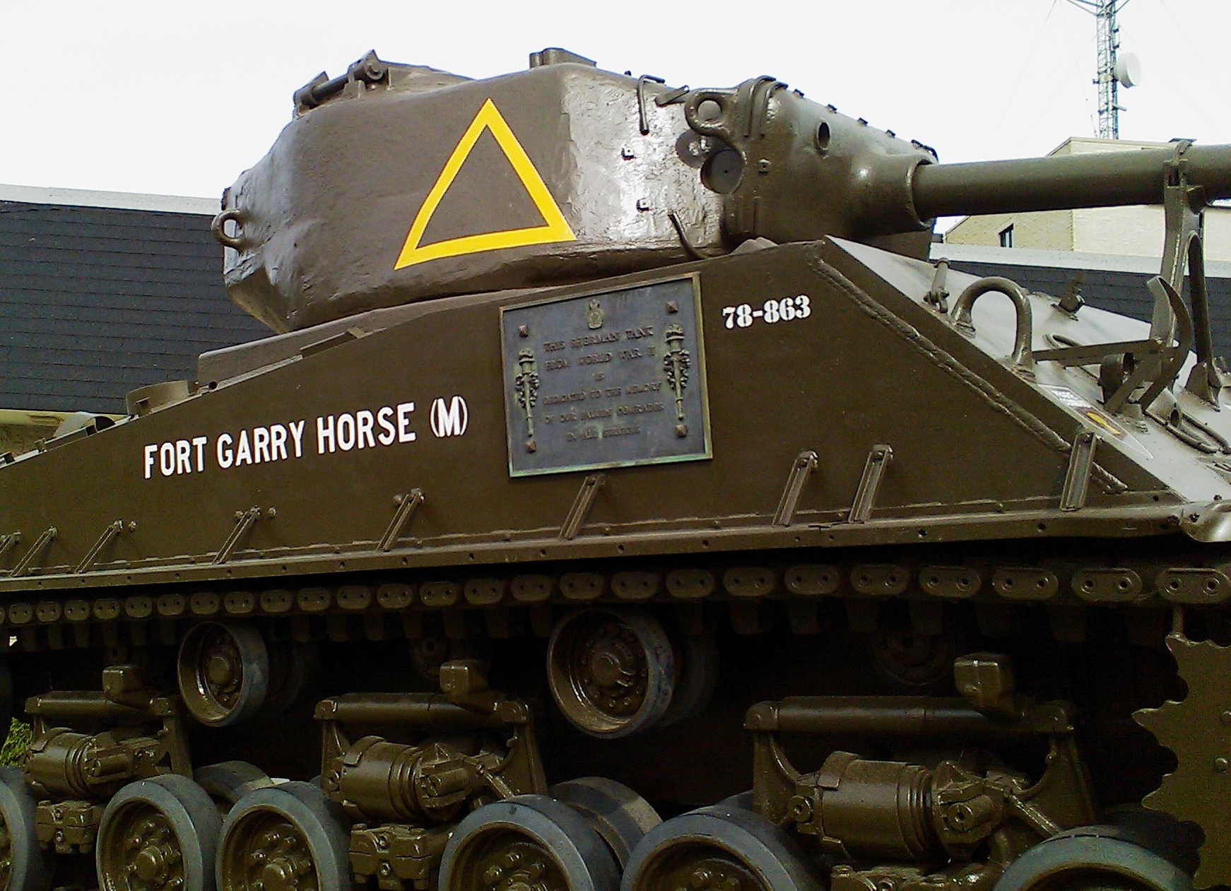 Canadian Medium Tank M4A2(76)W HVSS Sherman nicknamed “Easy 8”, DND No. 69041, (Serial No. 69-864), built by Fisher, Reg. No. 30129520, X, dedicated to the Fort Garry Horse, McGregor Armoury, 551 Machray Ave. Gifted to the city of Winnipeg in 1970 by “The Dutch Residents of Calgary in recognition of the efforts made by the Fort Garry Horse Regiment in the liberation of Holland in 1944” The tank was placed by the Metro Parks Committee on a small parcel of land bordering Smith St., Notre Dame Ave. and King Streets in the spring of 1970 as a “permanent memorial”. By September 1970, the tank had been vandalized numerous times and complaints had been made to city council concerning the display of militaristic objects on city property. The Parks Committee worked with the Fort Garry Horse to have the tank moved to a location “where it may receive the respect that it is due “.(Jason Ginn)