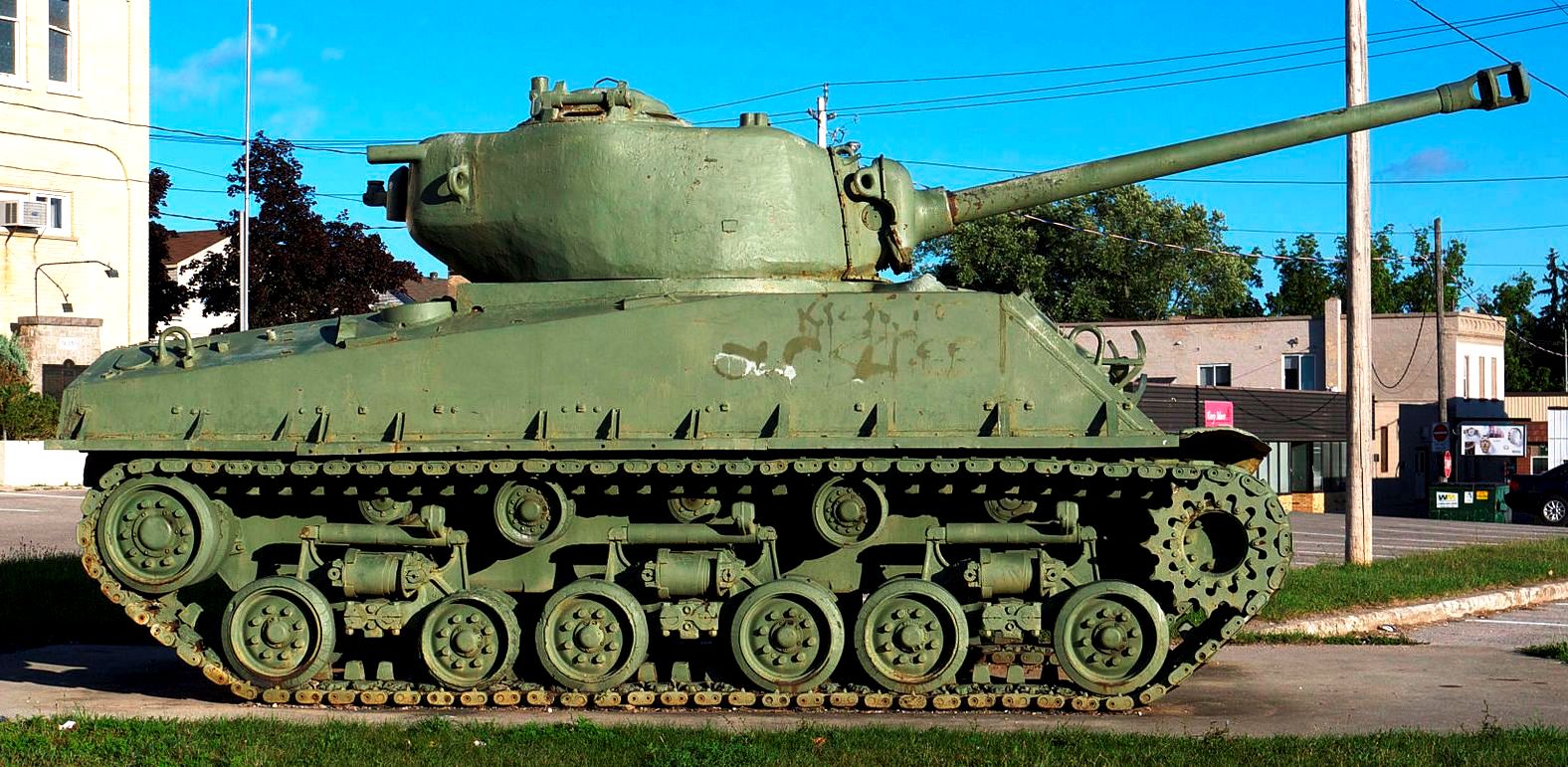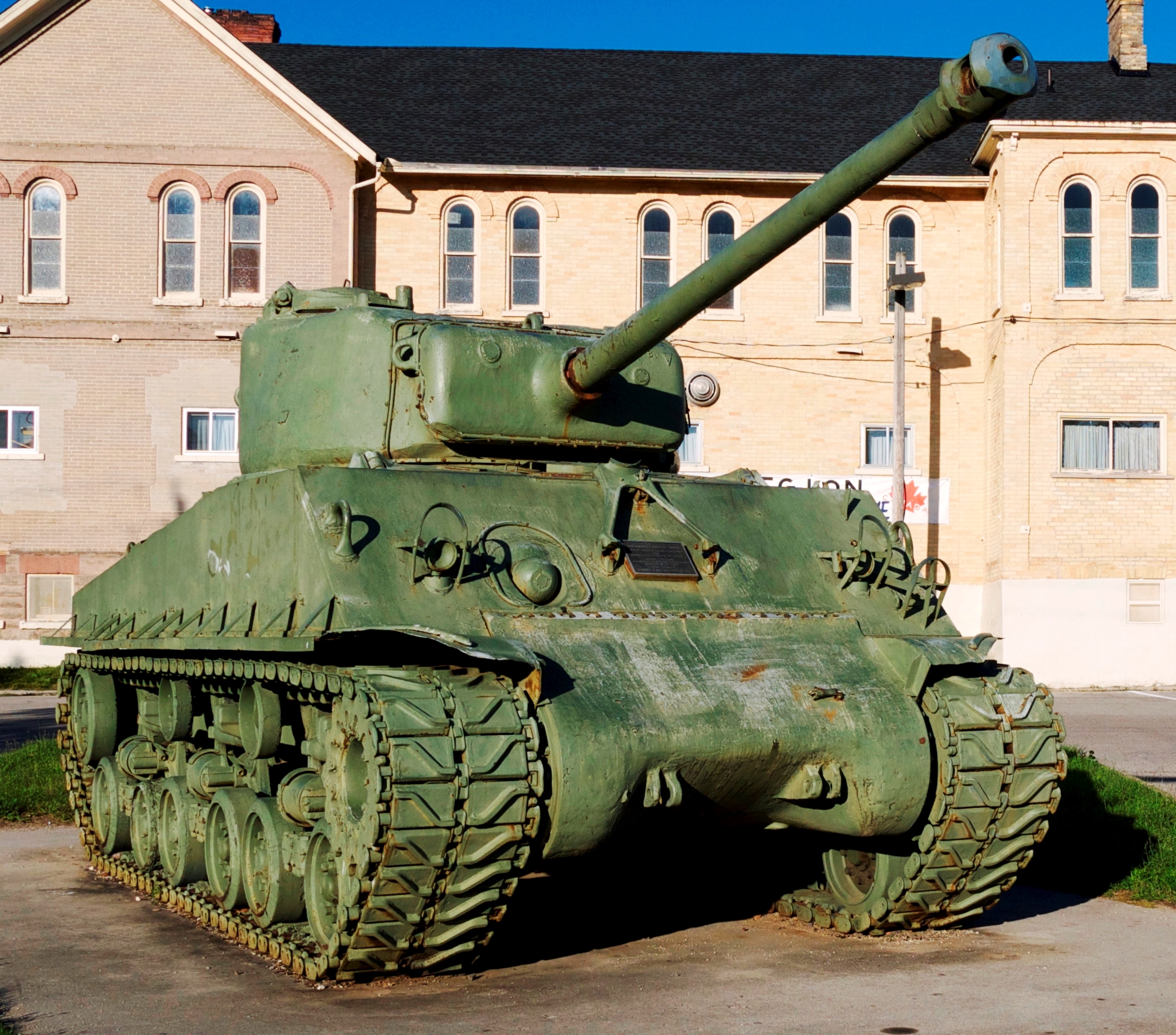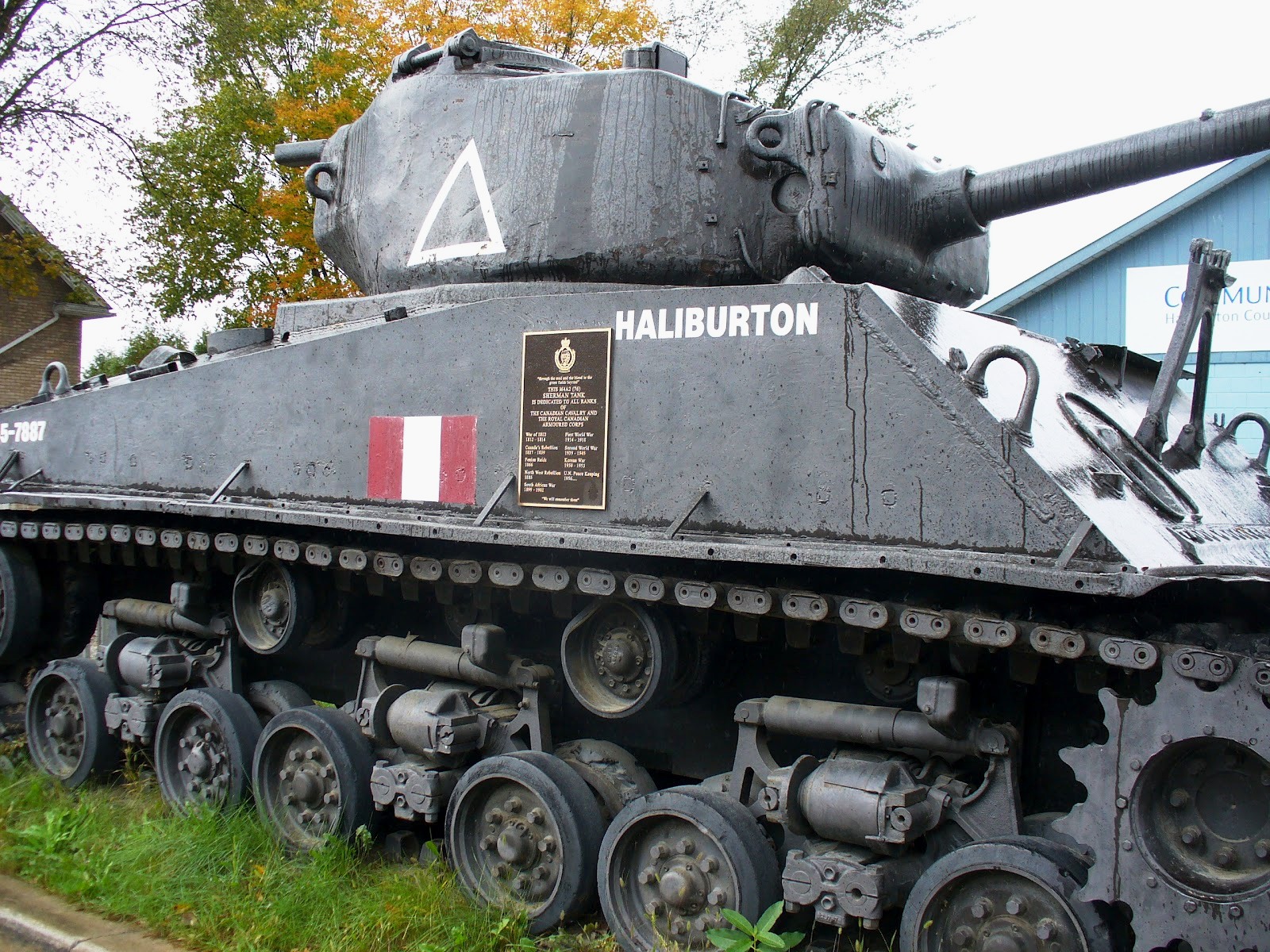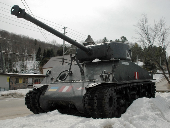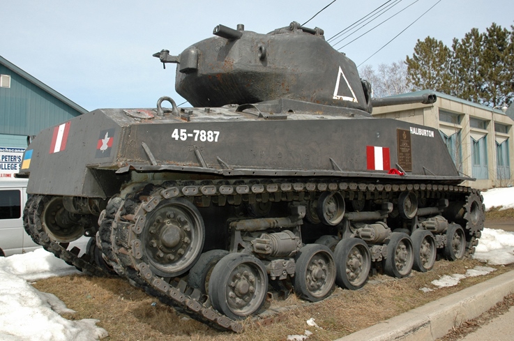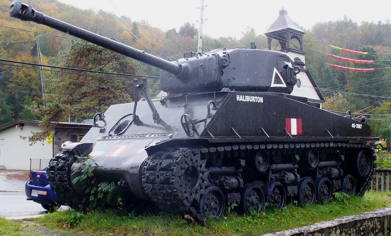 Canadian Medium Tank M4A2(76)W HVSS Sherman “Easy 8”, DND No. 69162, built by Fisher, Reg. No. 30129641, “Haliburton”, painted 45-7887. This tank stands in front of the Royal Canadian Legion Branch 129, 719 Mountain Street.