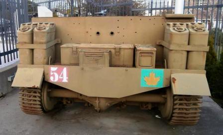 In late December 1945, the regiment requested authority to ship to Canada its M5A1 Stuart VI recce tank Serial No. WD CT271427, manufacturer’s number 10778, nicknamed “Press-On”, to assist in forming a regimental museum collection. This tank was salvaged and repaired by the unit’s Pioneer Platoon after being blown up on a mine in the battalion area. The turret was removed, and it served as the COs command and recce vehicle through action in Holland and Germany. The request cited its presence on the battlefield signified that the CO was present as an inspiration and confidence to all ranks. Its reputation as a mascot, led all those on strength at the end of hostilities to sign their names on the sides.] It is a late production M5A1, with periscope guards on the crew hatches, a large rear storage box, and a not uncommon mix of road wheel types. It now stands in front of the armoury in St. Catharines, Ontario.