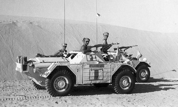Ferret Scout Car Mk. 1, 56 Recce Squadron, UNEF, Egypt, 1957. Left to Right: Sgt Robert Slaney, L/Cpl Belfontain, Tpr Cooper, out on petrol along the Frontier between Israel/ Egypt. Photo taken by Scovil Brown from another Ferret in the Troop of four.