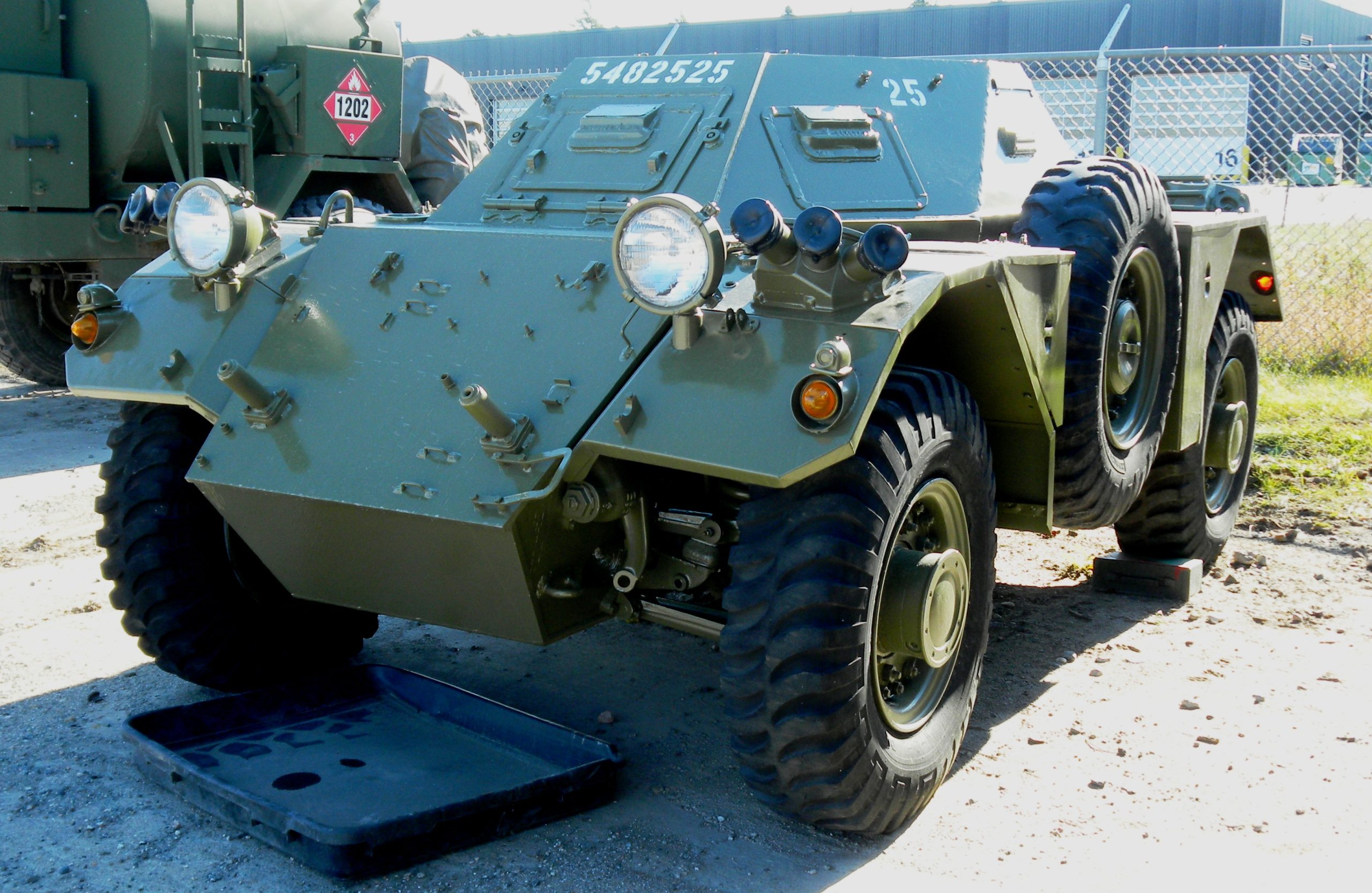 Ferret Scout Car Mk 1, CFR 54-82525, 25, previously painted all white, (Serial N. UNEF 1598), K17 Royal Canadian Armoured Corps School (RCACS) training compound South of Bldg J-7, 5 Canadian Division Support Base Gagetown.