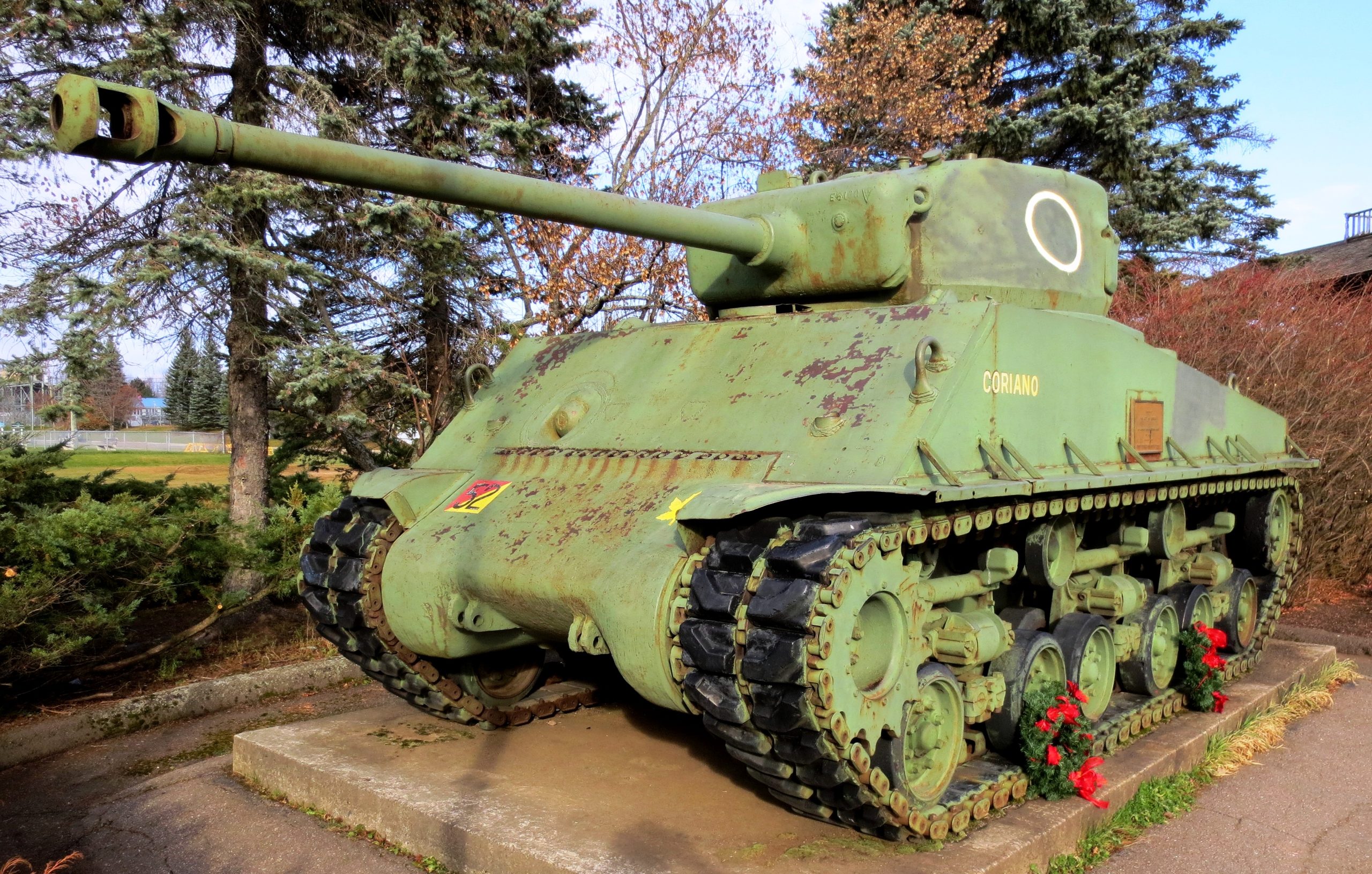 Canadian Medium Tank M4A2(76)W HVSS Sherman, nicknamed “Easy8”, Manufacturer’s Serial No. 65009, US Army Registration No. 30122988, DND Registration No. TBC, built by Fisher.  “Coriano”, Centennial Park, St. George Blvd., Moncton. This tank was donated to the city on 14 May 1972 by the 8th Canadian Hussars. The presiding officer at the ceremony was Brigadier General S. V. Radley Walters.