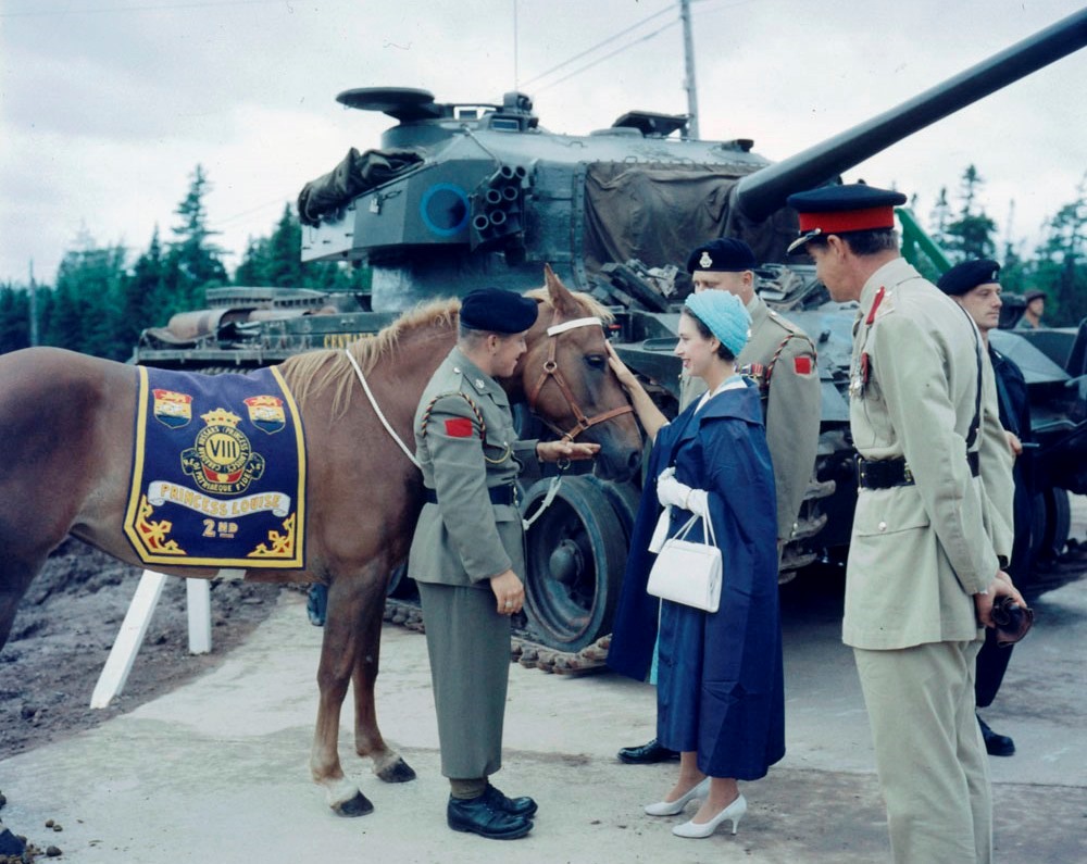 HRH Princess Margaret visiting the 8th Canadian Hussars at Camp Gagetown, New Brunswick, 7 Aug 1958. Trooper Ernie Budd is the mascot handler, Colonel S.V. Radley-Waters is behind her, the Centurion crew commander is Sergeant Ross Stoddart, and the British Officer is HRH Aide-de-Camp. Princess Margaret spent part of three days in the Fredericton area towards the end of her six-week Canadian tour. On her final day in the city, she attended a brief ceremony naming the multi-million dollar Trans-Canada Highway bridge “The Princess Margaret Bridge”.