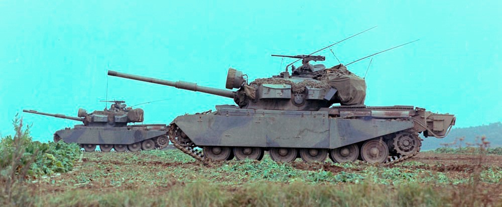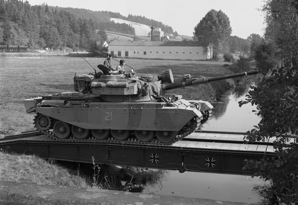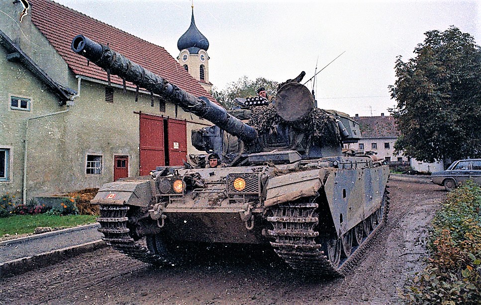A Centurion tank of “B” Squadron, Royal Canadian Dragoons, in support of “A” Company, 3 Mechanized Commando, crosses near Neustift, Germany, 1973.