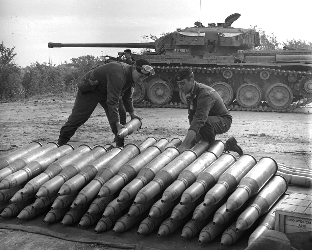 Officer cadets at Royal Canadian Armoured Corps School prepare ammunition for loading into Centurion tank at Meaford Tank Range, 3 Aug 1967.