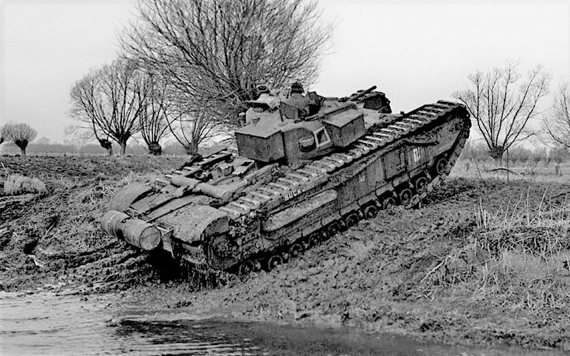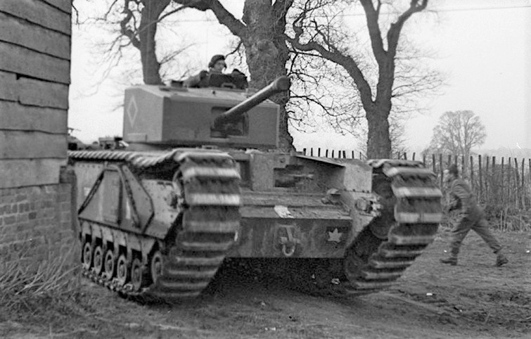 The origins of the Churchill’s design lay in the expectation that war in Europe might well be fought in conditions similar to those of the the First World War, and thus emphasized the ability to cross difficult ground. There were eleven bogies either side, each carrying two 10-inch wheels. Only nine of the bogies normally took the vehicle weight, the front coming into play when the vehicle nosed into the ground or against an obstacle, the rear acting in part as a track tensioner. Due to the number of wheels, the tank could survive losing several without much in the way of adverse effects as well as traversing steeper terrain obstacles. The Churchill had many variations, including many specialized modifications. The most significant change to the Churchill was that it was up-gunned from 2-pounder to 6-pounder and then 75 mm guns over the course of the war. By the war’s end, the late model Churchill Mk VII had exceptional amounts of armour – considerably more than the German Tiger tank. (Wikipedia)