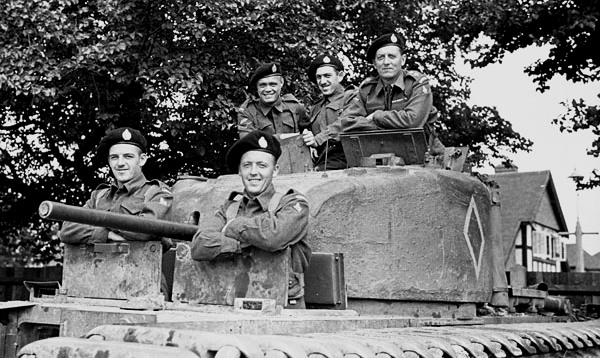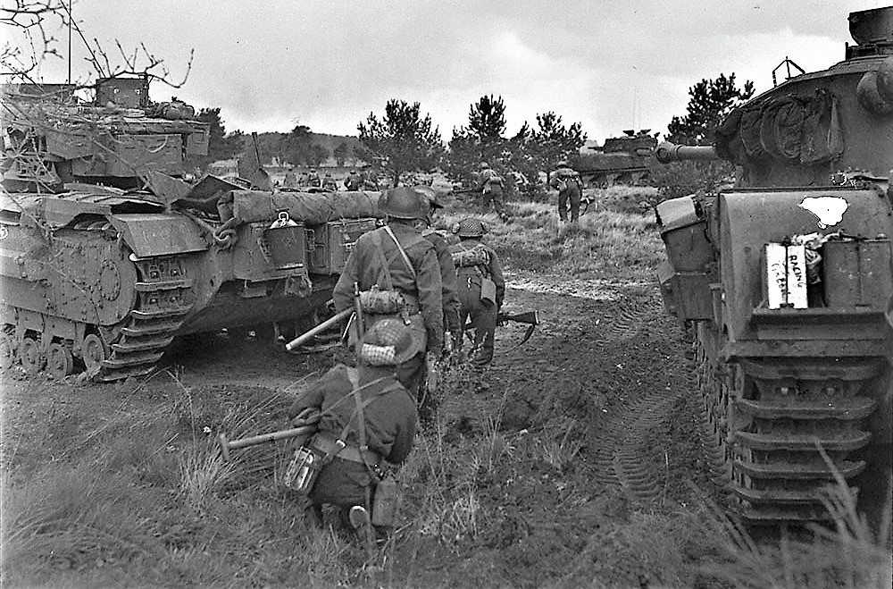 Infantry of Les Fusiliers de Mont-Royal Regiment taking cover between two British 79th Armoured Division Churchill tanks and a Fort Garry Horse Sherman, during an attack in the vicinity of Oldenburg, Germany, 29 April 1945.