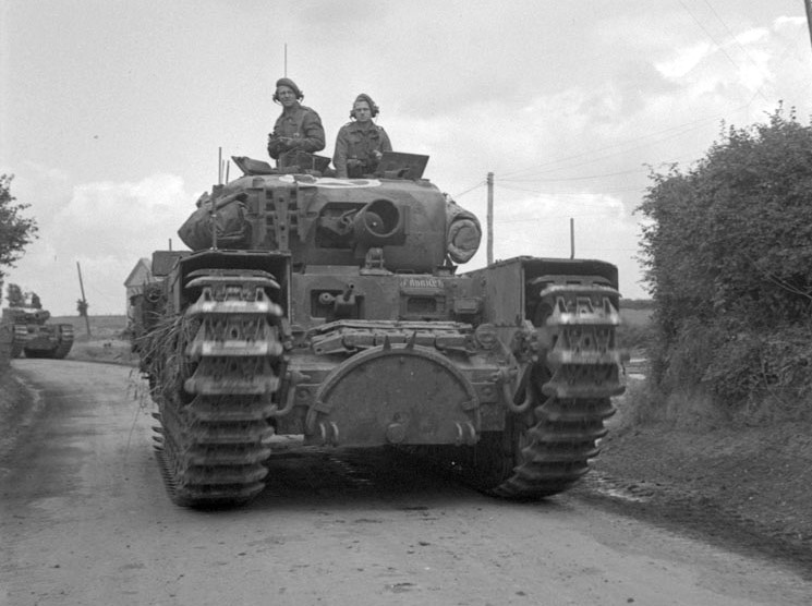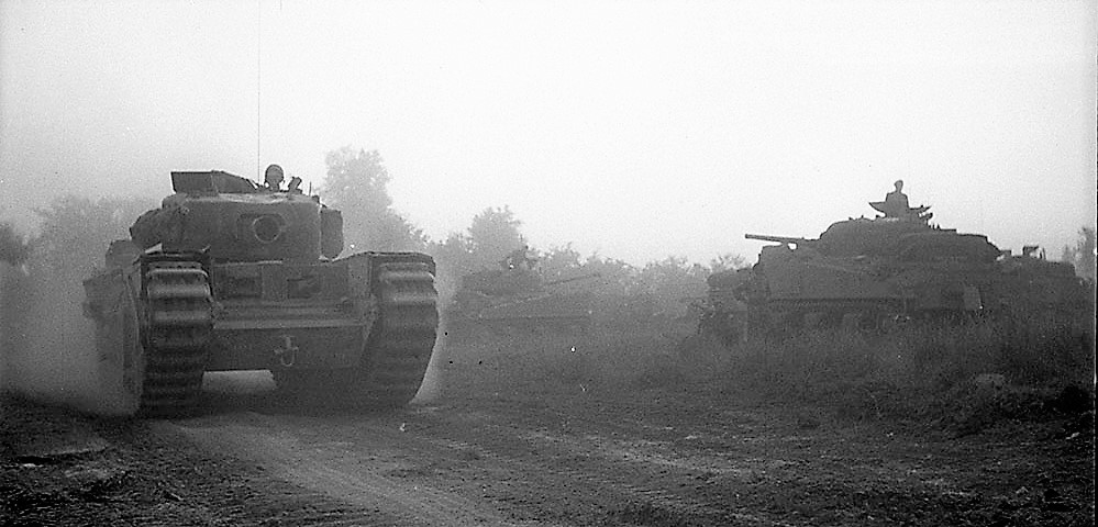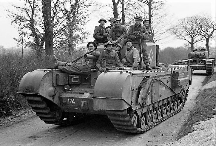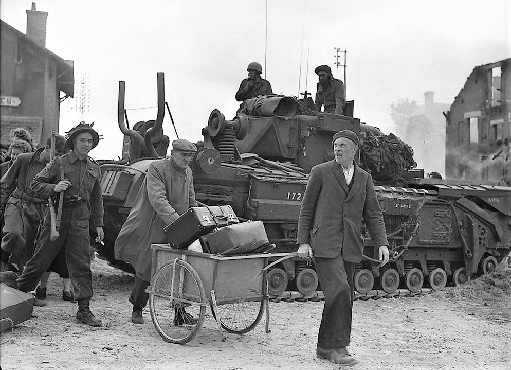 Churchill tank armed with a 95-mm close-support howitzer in place of the main gun, with the 8th Canadian Infantry Brigade advancing in first stage of the attack of Caen, 18 July 1944.