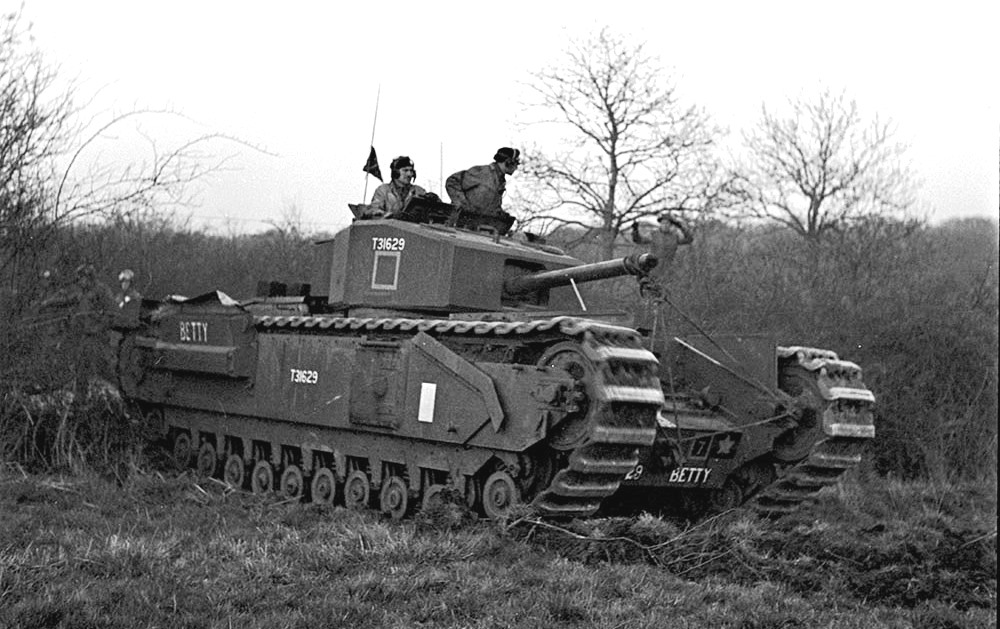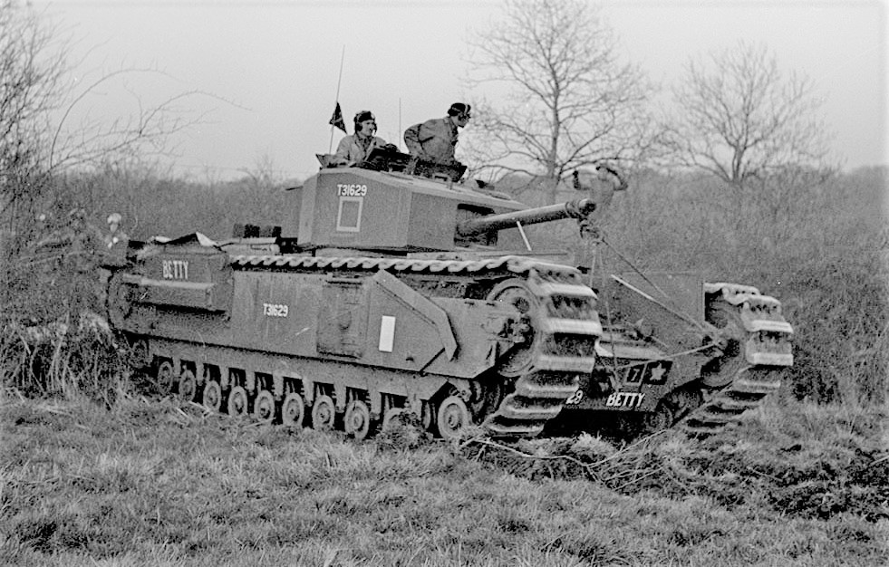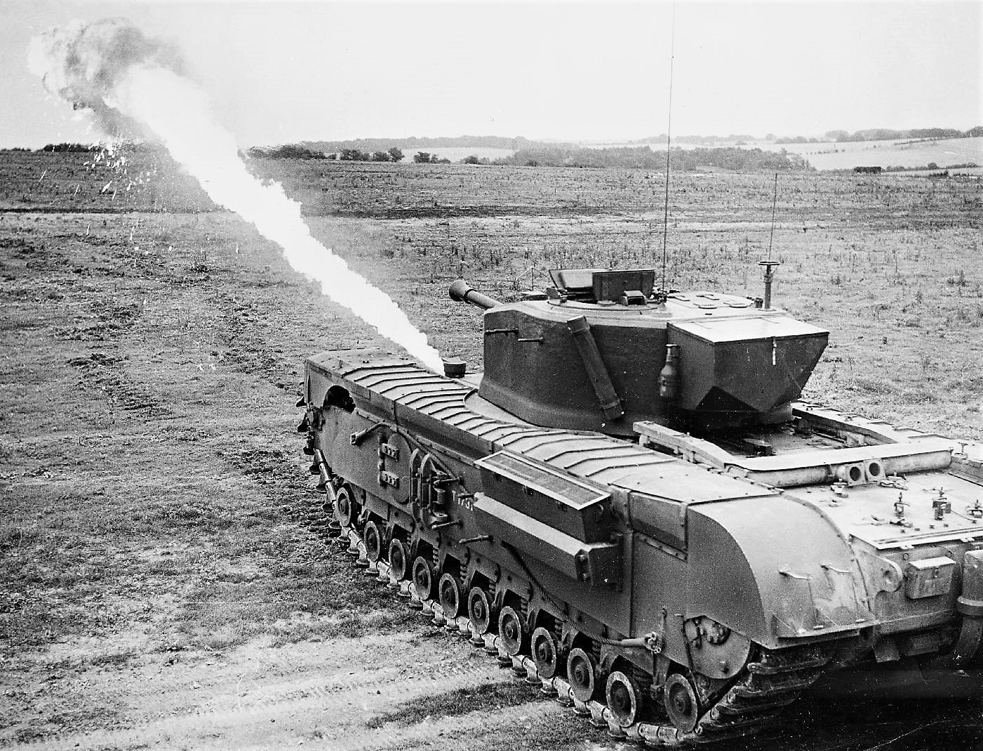 Churchill AVRE armed with a 240-mm “dustbin” petard in place of the main gun, Normandy, 25-27 June 1944.