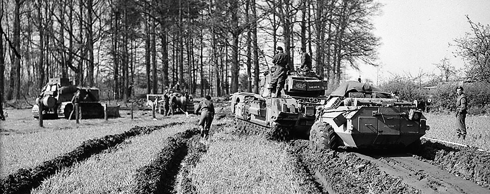 Bulldozer towing ‘Crocodile’ armoured vehicle of the 1st Fife and Forfar Yeomanry out of mud. Bathmen, Netherlands, 9 April 1945.