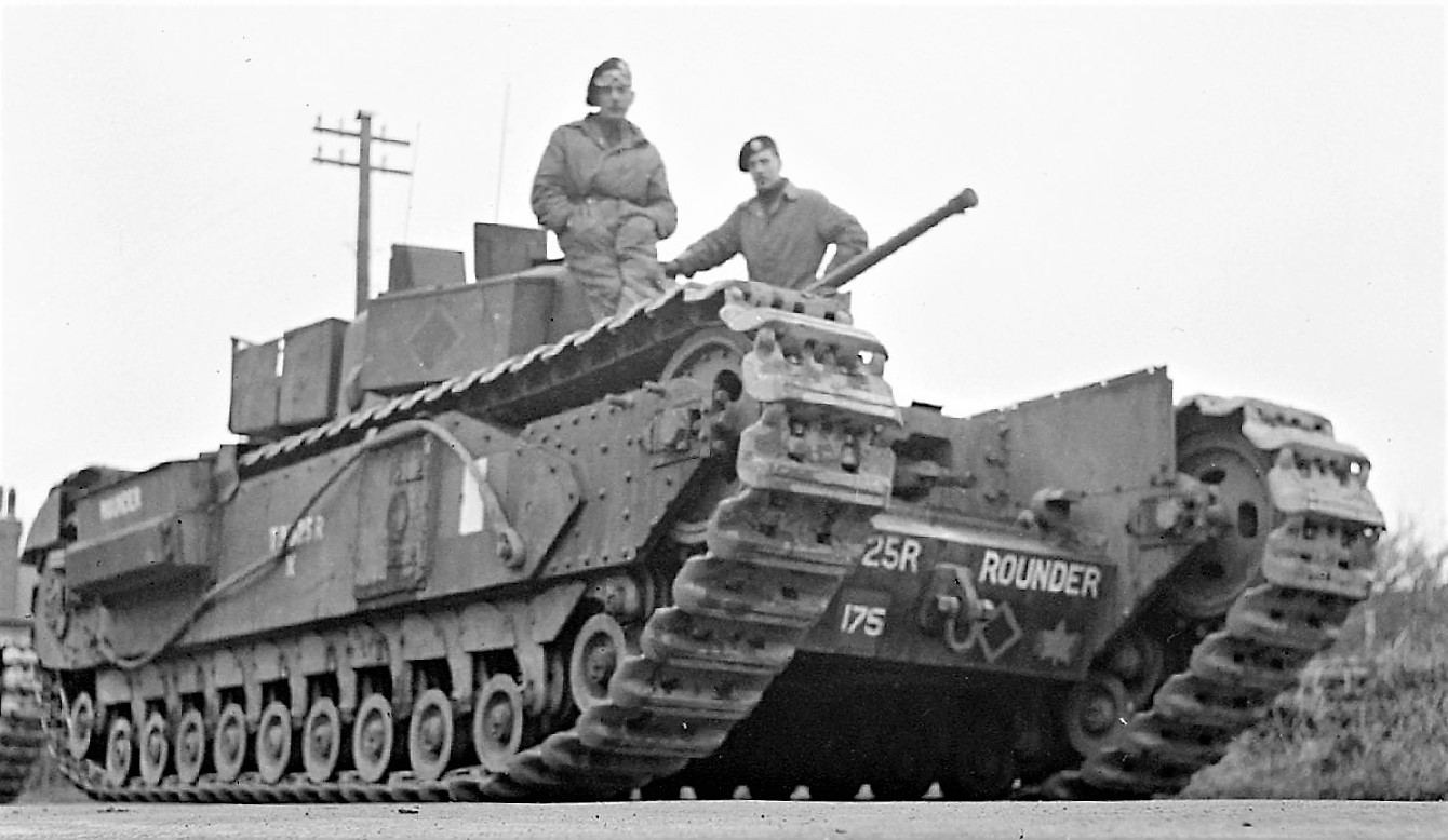 Churchill Mk. 2, 14th Canadian Army Tank Regiment, (Calgary Tanks), Regimental Head Quarters tank, post Dieppe Raid . The original ROUNDER that landed in Dieppe was T-68452, this tank is a rebuilt one, as seen by the “R” at the end of the WD number. (Anthony Sewards)