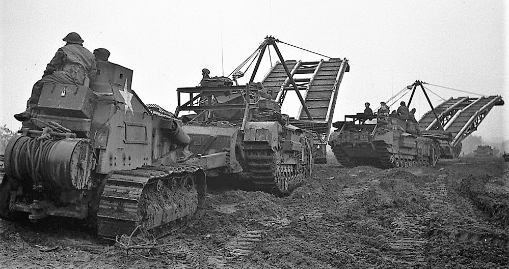 Churchill AVRE box girder bridge layers waiting to take part in an attack, 8 Feb 1945.