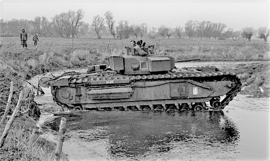 Churchill tank with the British 79th Armoured Division, which landed in support of the Canadian landings on D-Day. This tank was the close support version of the Churchill Mk. IV armed with a 95-mm close-support howitzer in place of the main gun. It was used for busting bunkers. The photo would have been taken shortly after the 6 June 1944 landings. The “Y”-shaped pipes on the rear decking are exhaust pipe extensions to allow deep wading.