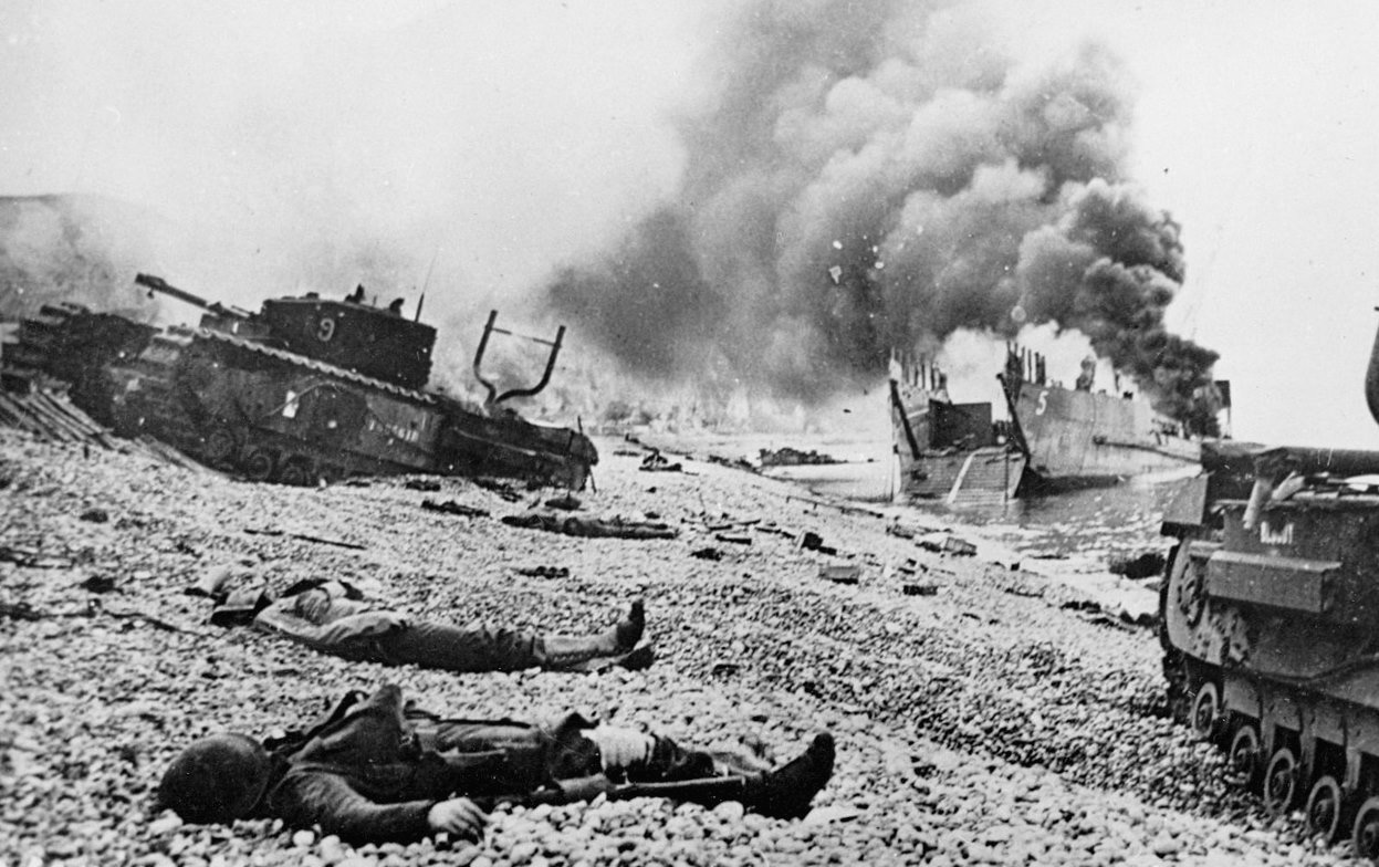 Churchill tanks on the Dieppe beach, 19 August 1942. A burning LCT (Landing Craft, Tank) TLC5 No. 121 near the beach after the raid by allied (mostly Canadian) air, naval and land forces on german defences. Churchill tanks and bodies of allied servicemen are pictured on the beach. The tank at left is one from 9 Troop 14th Army Tank Battalion (The Calgary Regiment (Tank)) which was transported by TLC5.