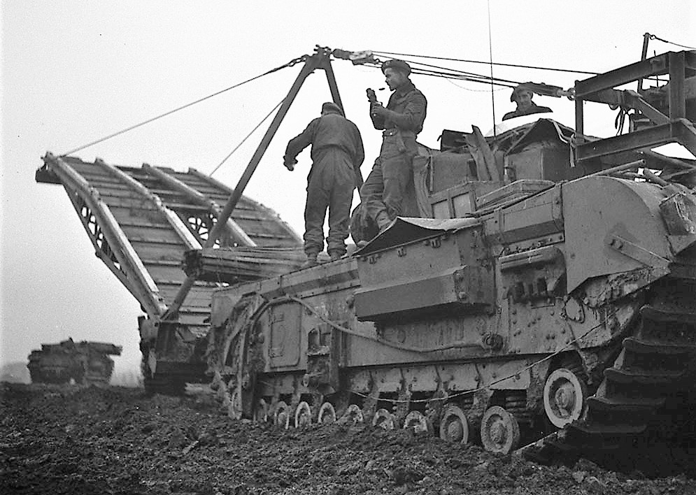 Bulldozer with a pair of Churchill AVRE box girder bridge layers waiting to take part in an attack, 8 Feb 1945.