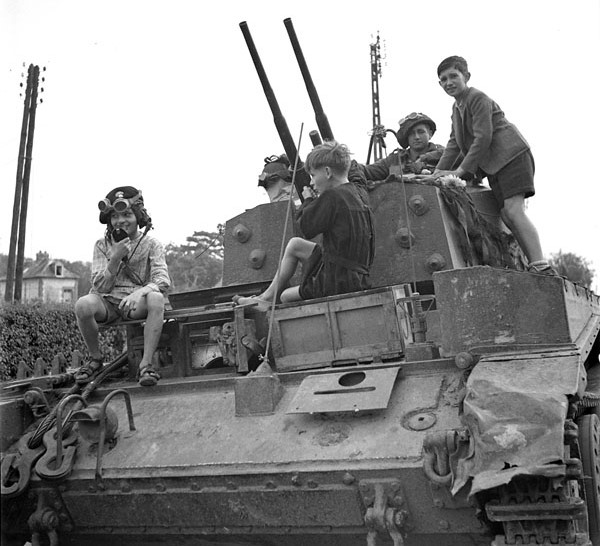 Guardsman R.W. Ferguson of The Canadian Grenadier Guards watches two French children examining his Centaur Mk. II anti-aircraft vehicle, Elbeuf, France, 28 August 1944.