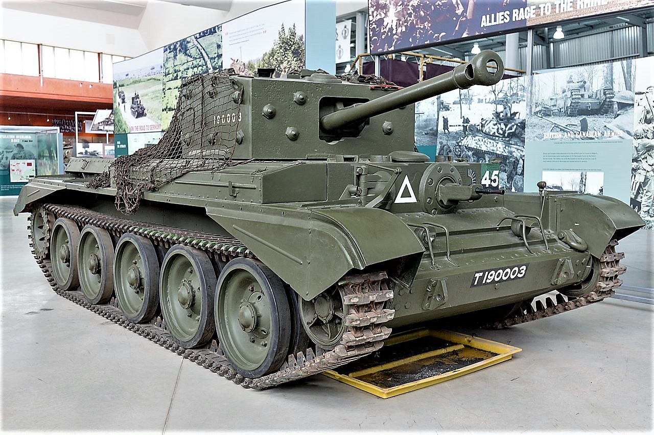 The name “Cromwell” was initially applied to three vehicles during development. Early Cromwell development led to the creation of the A24 Cavalier. Later Cromwell development led to the creation of the competing Tank, Cruiser, Mk VIII, Centaur (A27L) design. The Centaur tank was closely related to the Cromwell, both vehicles being externally similar. The Cromwell and Centaur tanks differed in the engine used; the Centaur had the 410 hp Liberty engine, the Cromwell had the significantly more powerful 600 hp Meteor; Centaur hulls were converted to Cromwells by changing the engine. The Cromwell first saw action in the Battle of Normandy in June 1944. The tank equipped the armoured reconnaissance regiments of the Royal Armoured Corps, in the 7th Armoured Division, 11th Armoured Division and the Guards Armoured Division. While the armoured regiments of the latter two divisions were equipped with M4 Shermans, the armoured regiments of the 7th Armoured Division were equipped with Cromwells. The Centaurs were not used in combat except for those fitted with a 95 mm howitzer, which were used in support of the Royal Marines during the amphibious invasion of Normandy. (Wikipedia)