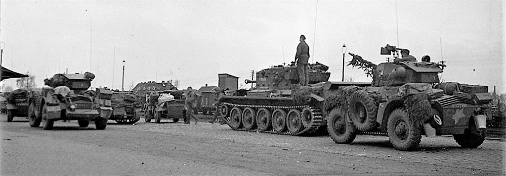 Cromwell tank and armoured vehicles passing through to reinforce spearhead, Northwest Europe, 4 April 1945.