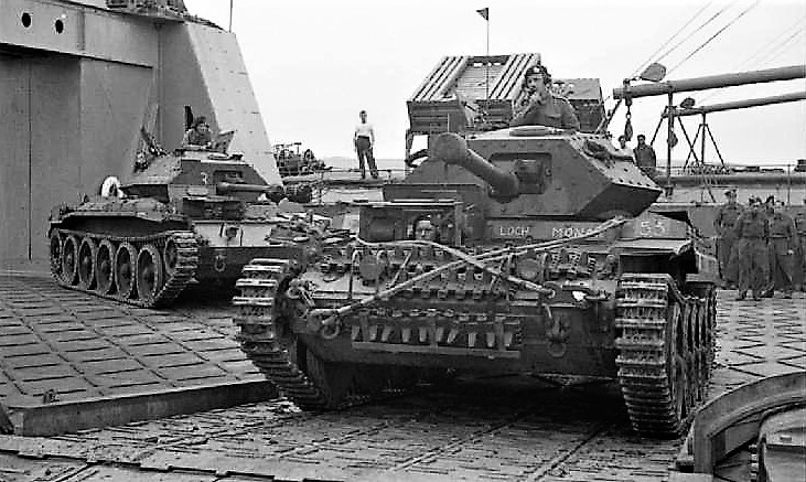 Crusader III tanks cross to a floating pier from a ‘Spud’ pontoon during artificial harbour tests, UK, 23 June 1943.
