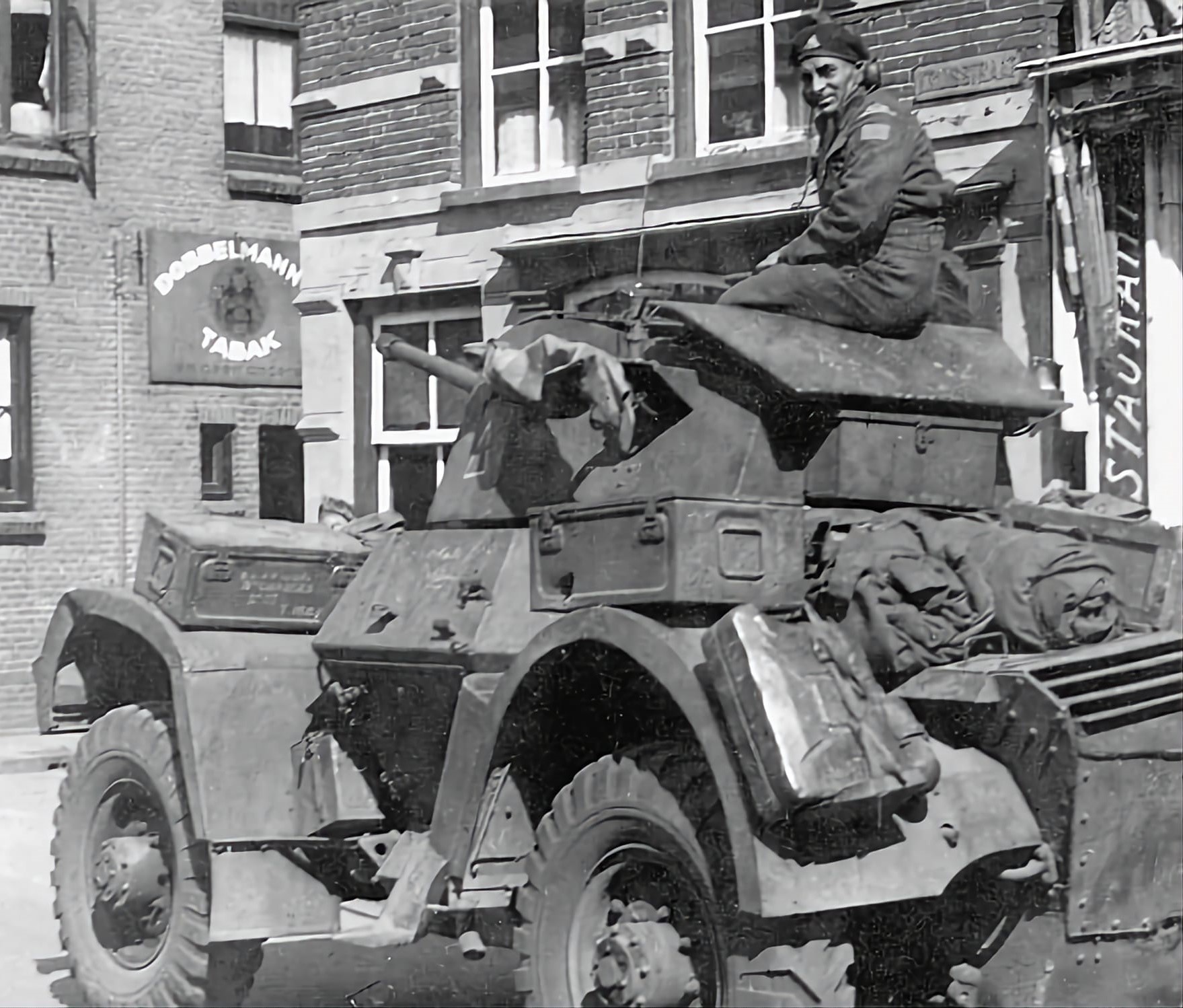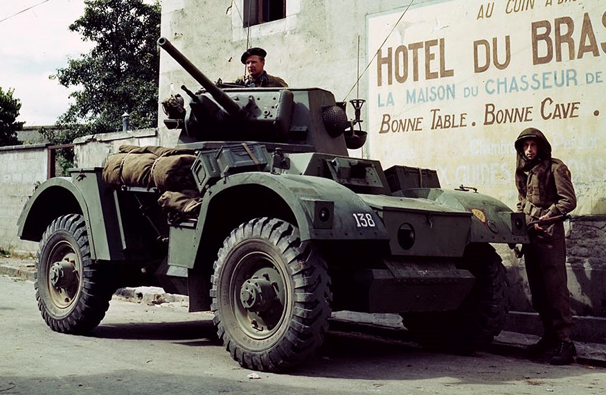 Belgians and Canadians in a Daimler Armoured Car at Sallenelles, France, August 1944.