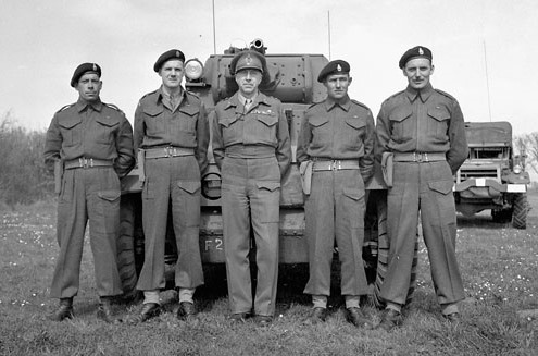 General H.D.G. Crerar, General Officer Commanding-in-Chief First Canadian Army, with personnel of The Royal Montreal Regiment, in front of a Daimler armoured car, Grave, Netherlands, 11 April 1945.