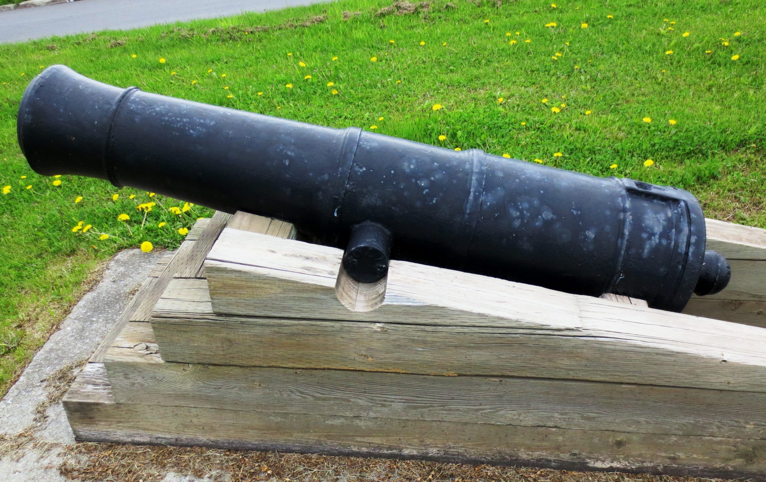 Cast Iron 32-pounder 17-cwt Smoothbore Muzzleloading Carronade with a Blomefield pattern breeching ring, maker and Serial No. unknown, mounted on a wooden naval carriage near the Gaspé Lighthouse.