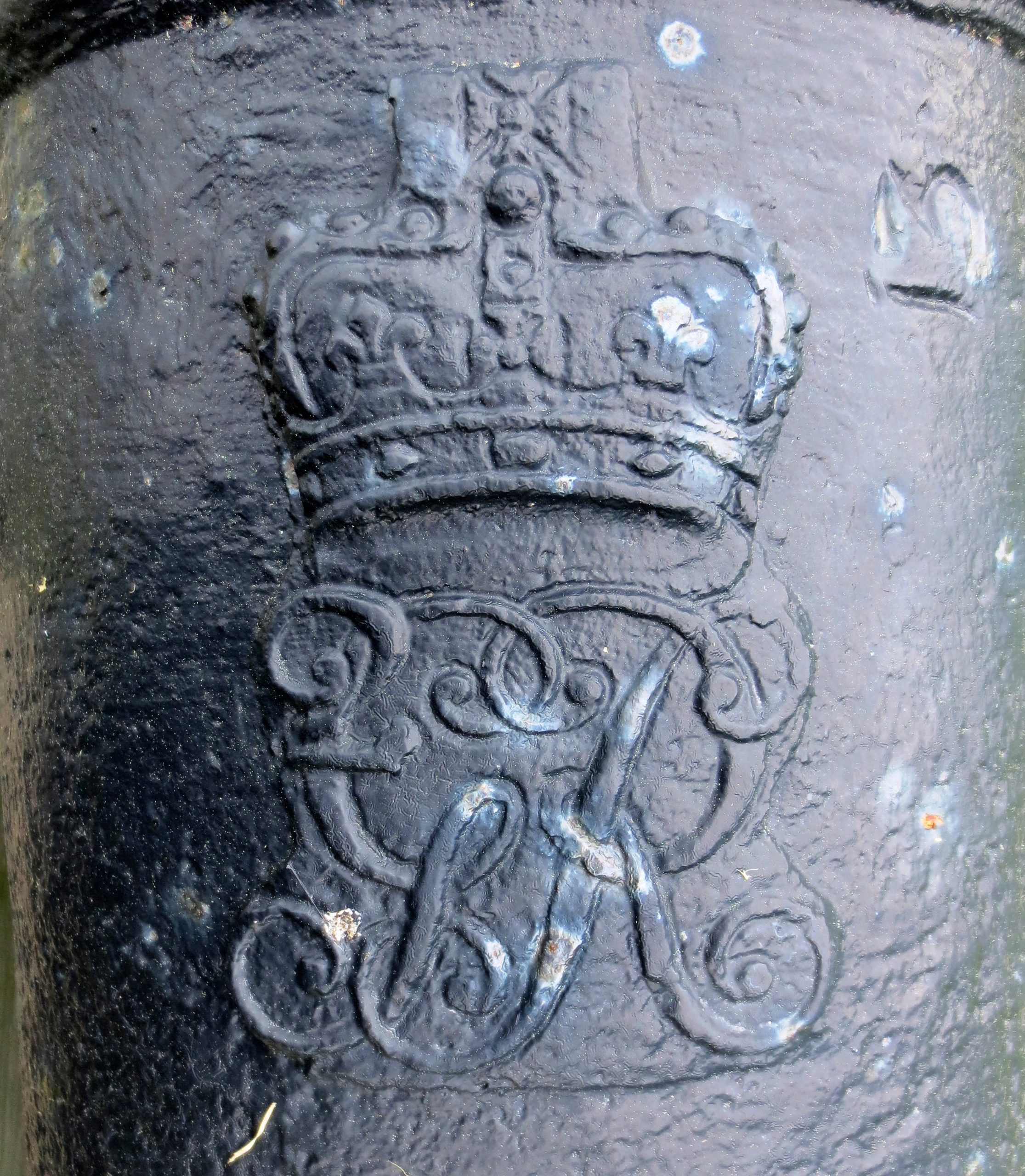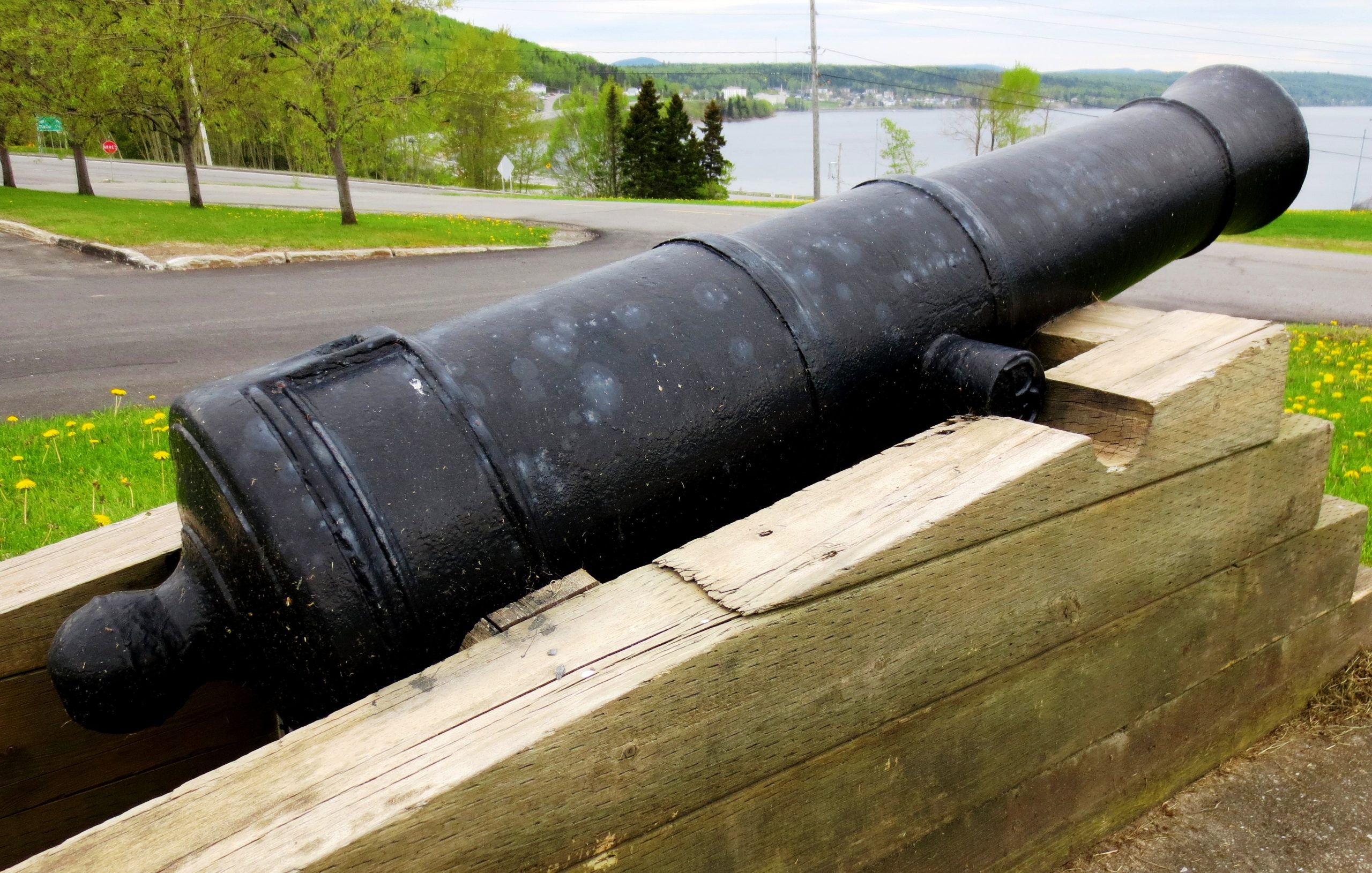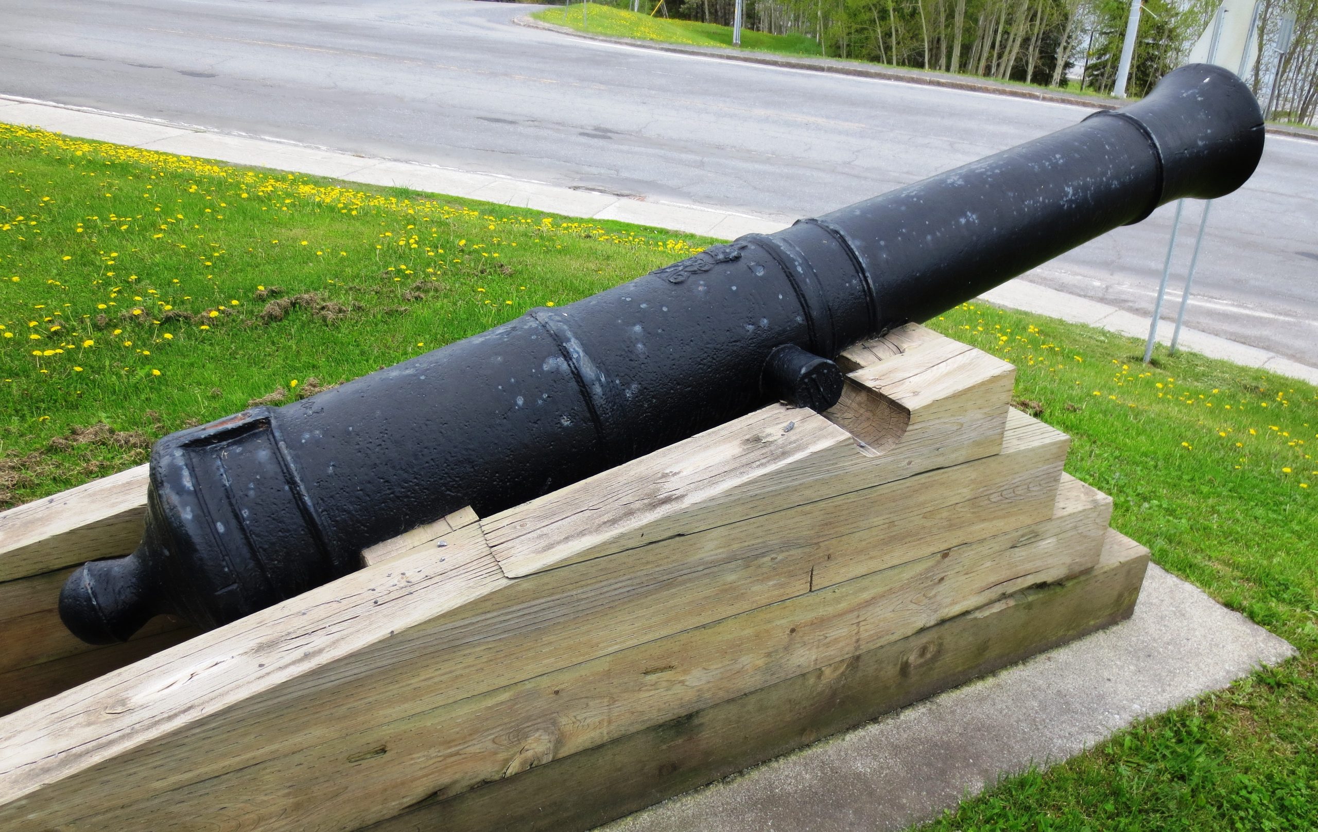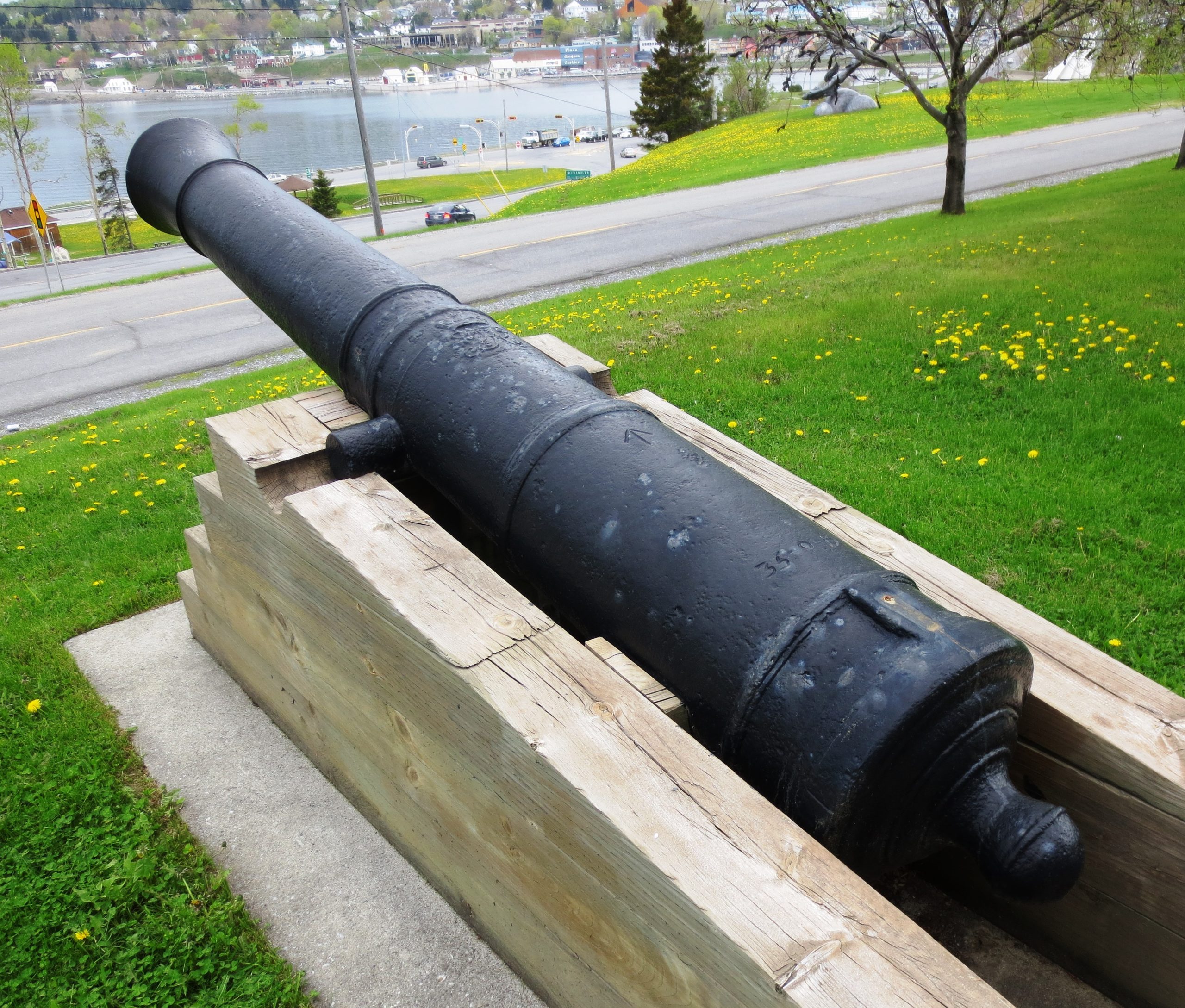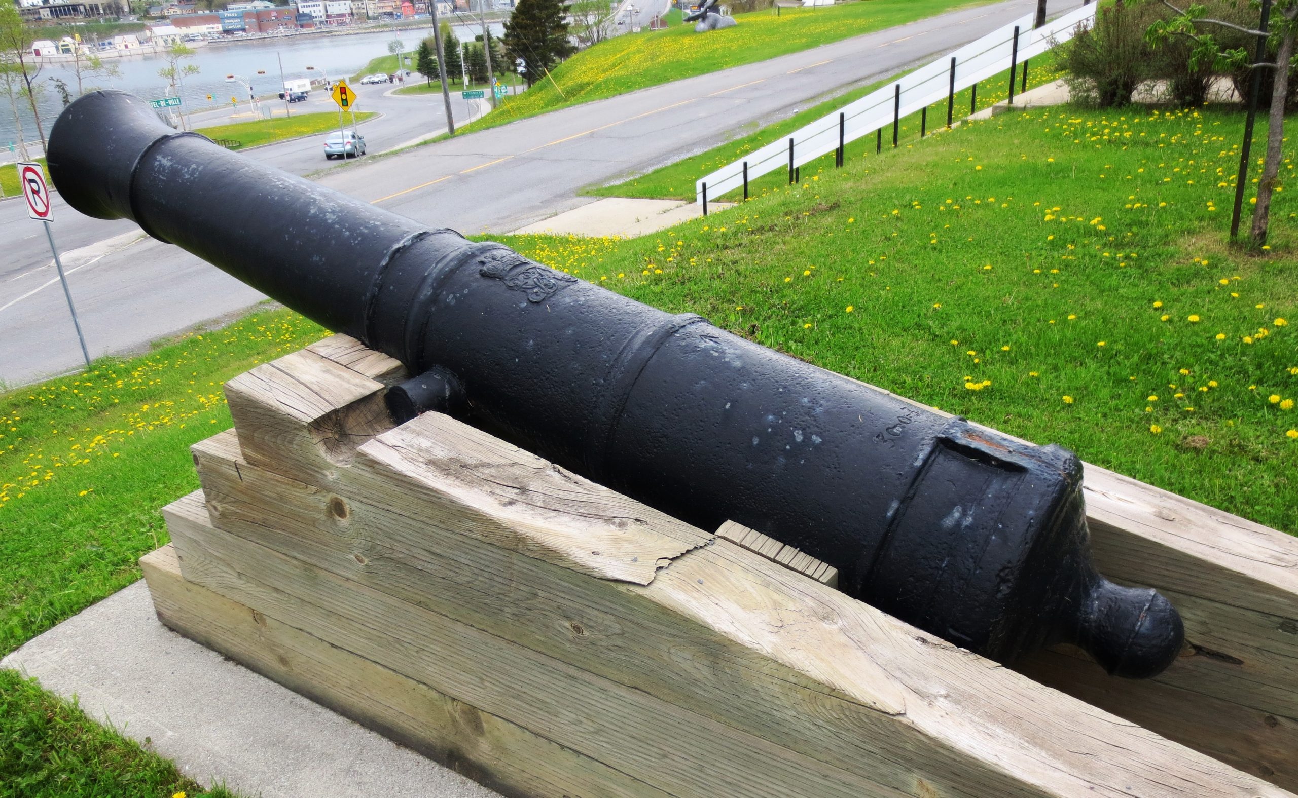 Cast Iron 12-pounder 30-cwt Smoothbore Muzzleloading Gun, weight 30-0-3 (3,363 lbs), W (possibly for the Waldron foundry) on the right trunnion, King George II cypher, ca. 1740, No. 3 mounted on a wood box in front of the Hotel de Ville. On loan from the Museé de la Gaspésie.