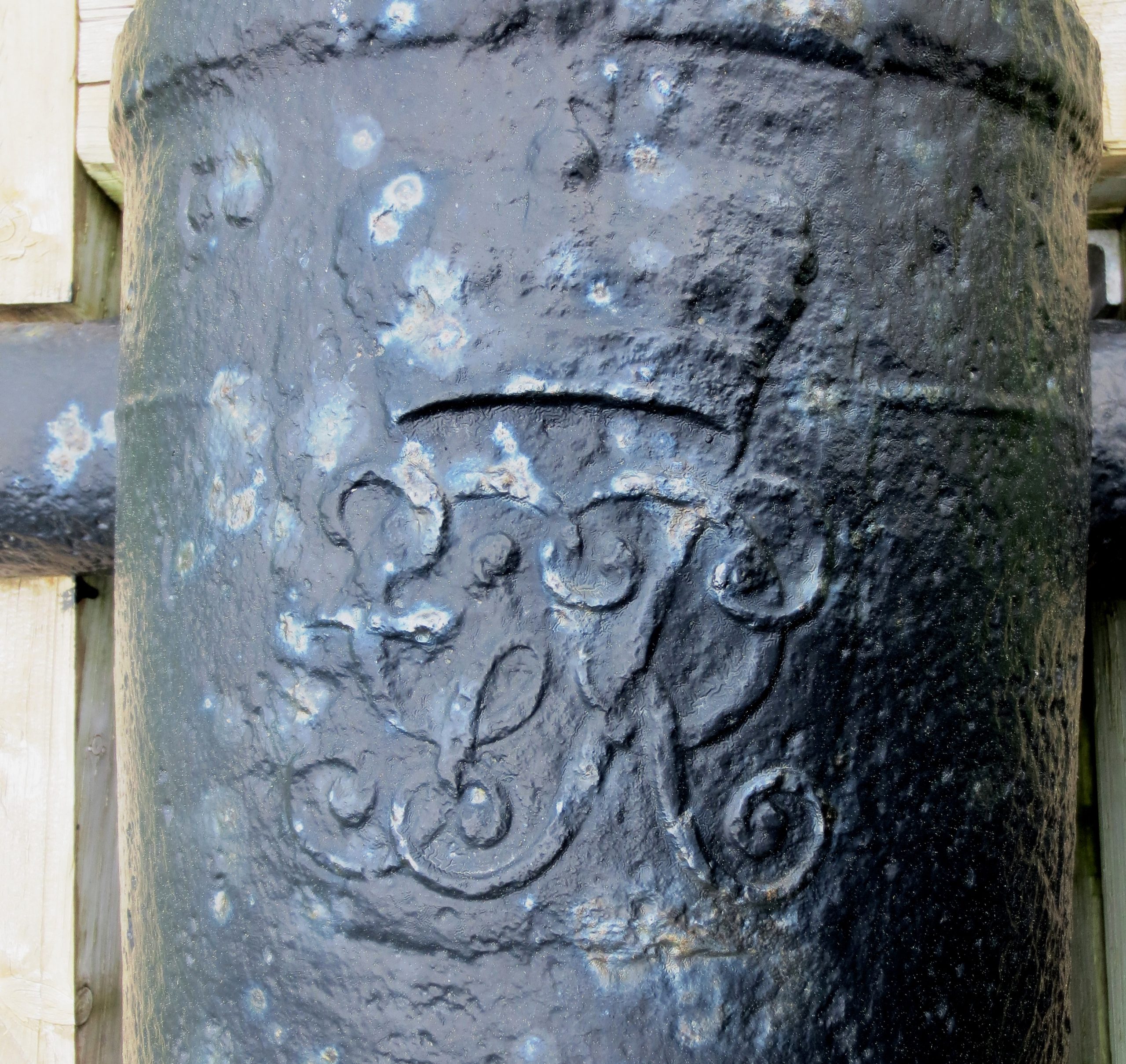This Gun is on loan from the Museé de la Gaspésie. The ‘B’ stands for Bersham, near Wrexham in north Wales, showing that this gun was cast by John Wilkinson at his foundry there. The legend ‘SOLID’ on the trunnion shows that this is a gun bored out of the solid, therefore at the time, both up-to-date and expensive. In fact this gun is a ‘B-SOLID’ product of Bersham. These guns are based on what became known as the ‘Armstrong pattern’ which was introduced into British military service in 1729 and was current up until 1787. The gun can be dated to ca. 1773 (when the ‘B-SOLID’ trunnion mark makes its first appearance) to 1796. The last known reference to Wilkinson supplying guns dates to 1796, when the final guns definitely marked with ‘B-SOLID’ were proofed on 9 -10 May for Wiggins and Graham. These were not guns for government service, as they have no royal badge or any other markings on the barrel, and also they are shorter than the normal government pattern Cast Iron 6-pounder. SBML Gun. Information from the Ordnance Bill Books for the period 1773 – 1796 indicates that standard lengths for government service were 6, 6½ and 7ft, although a few were made in non-standard sizes of 4½ and 8½ft. Guns of this type were cast by gunfounders for the civilian market, usually for smaller merchant ships, coastal communities or landowners who wanted some defence but also wanted something lighter and cheaper than a normal gun. (Dr Brian G. Scott)