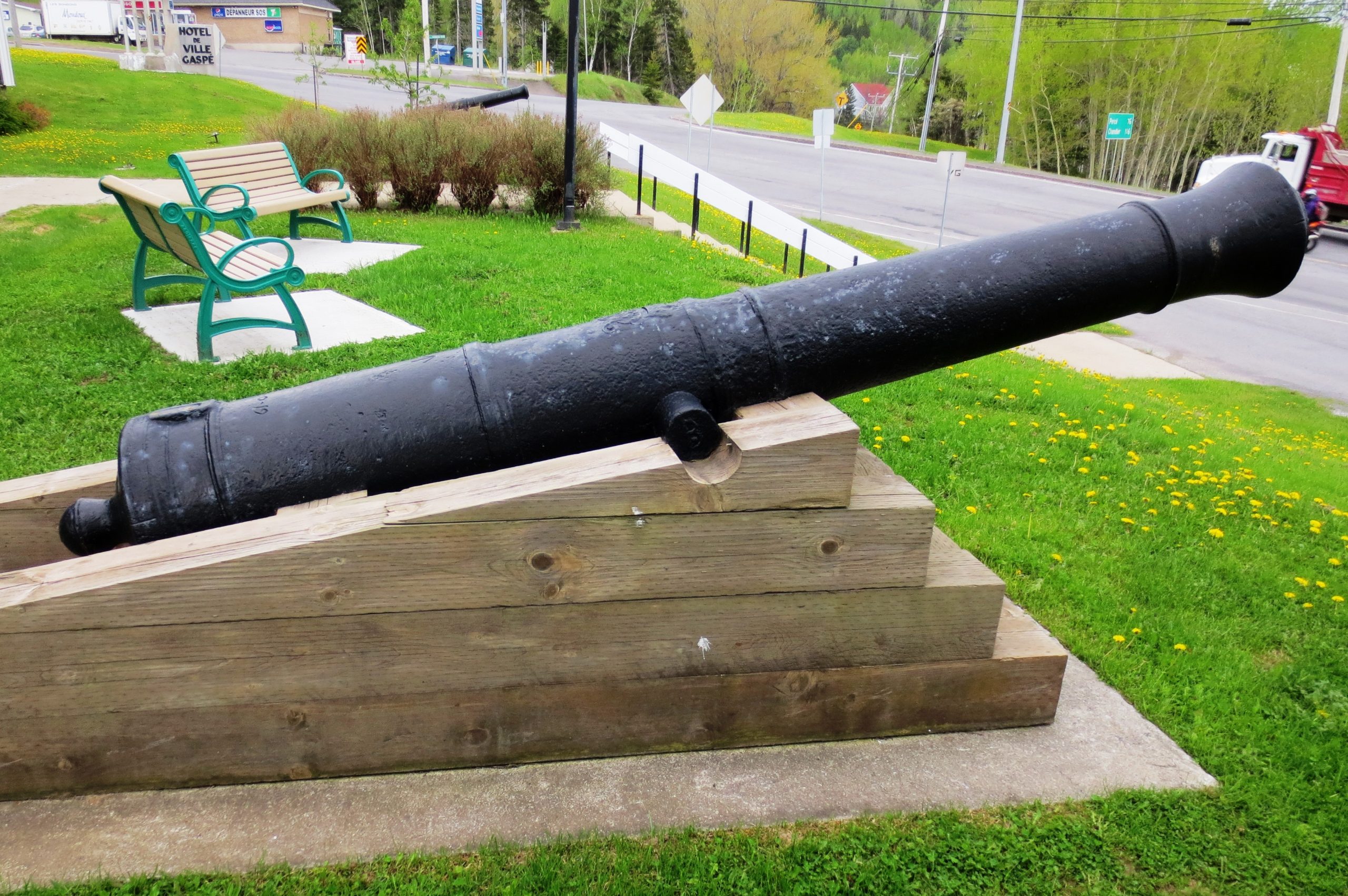 Canon à chargement par la bouche en fonte de 12 livres 30 cwt Smoothbore, poids 30-0-3 (3363 lbs), W (peut-être pour la fonderie Waldron) sur le tourillon droit, King George II cypher, ca. 1740, n ° 3 monté sur un coffret en bois devant l’Hôtel de Ville. Prêt du Museé de la Gaspésie.