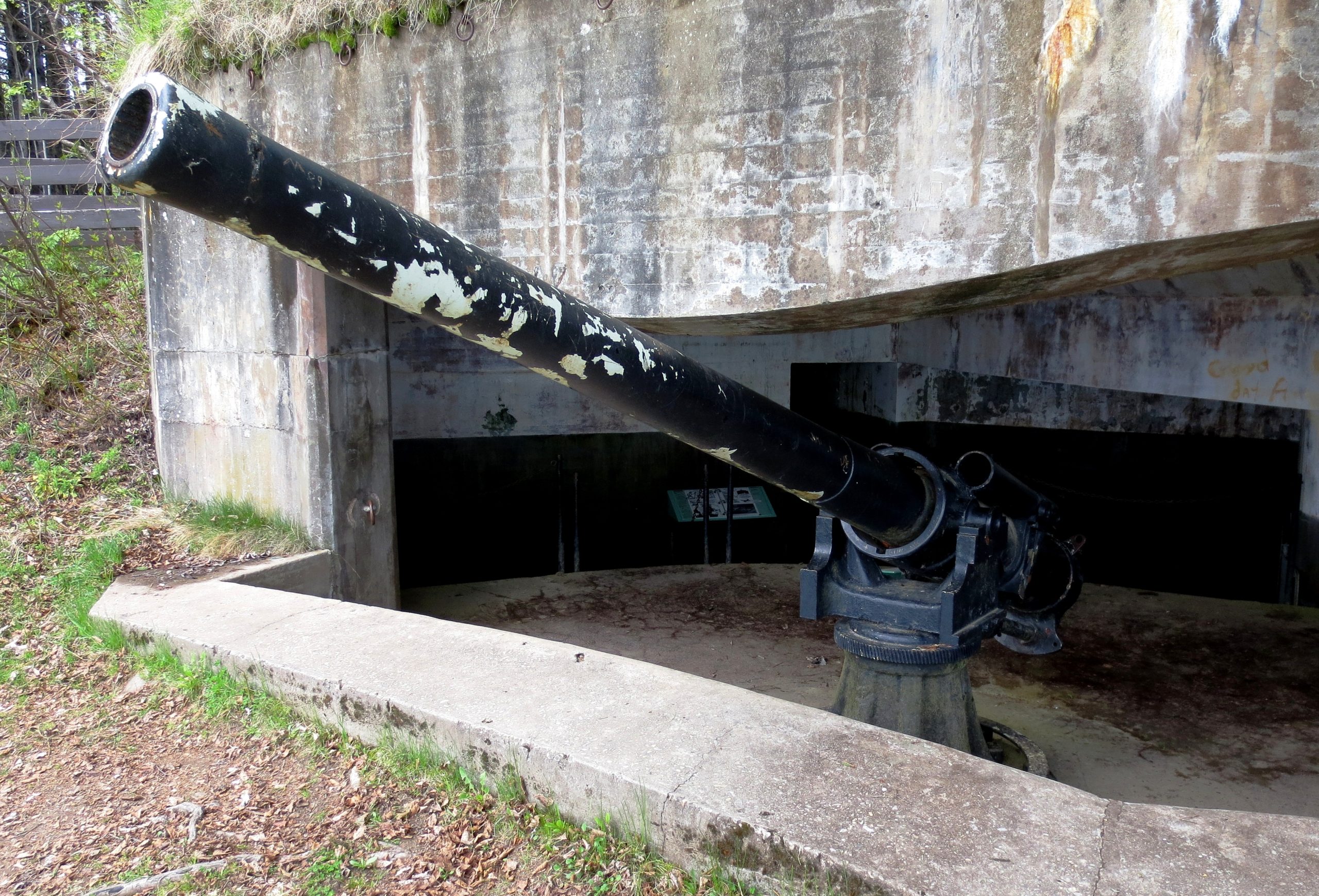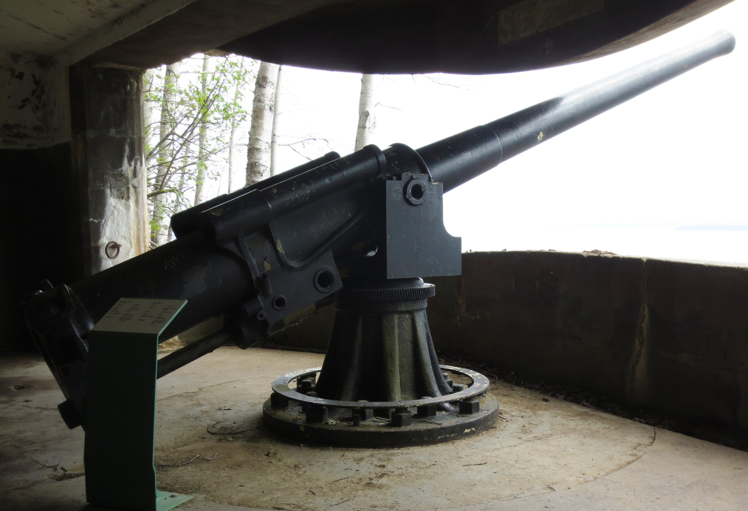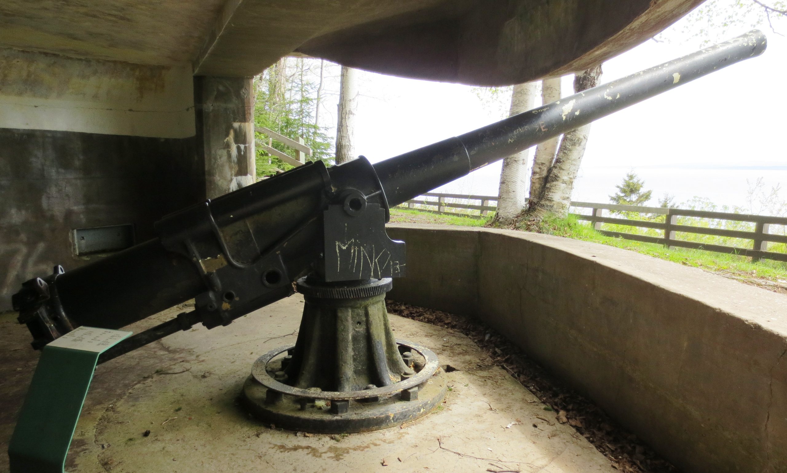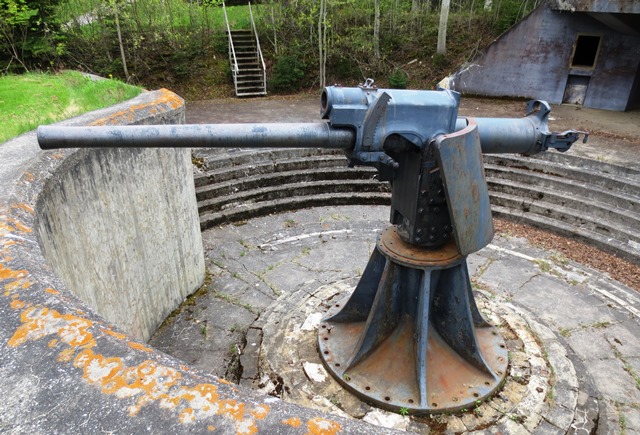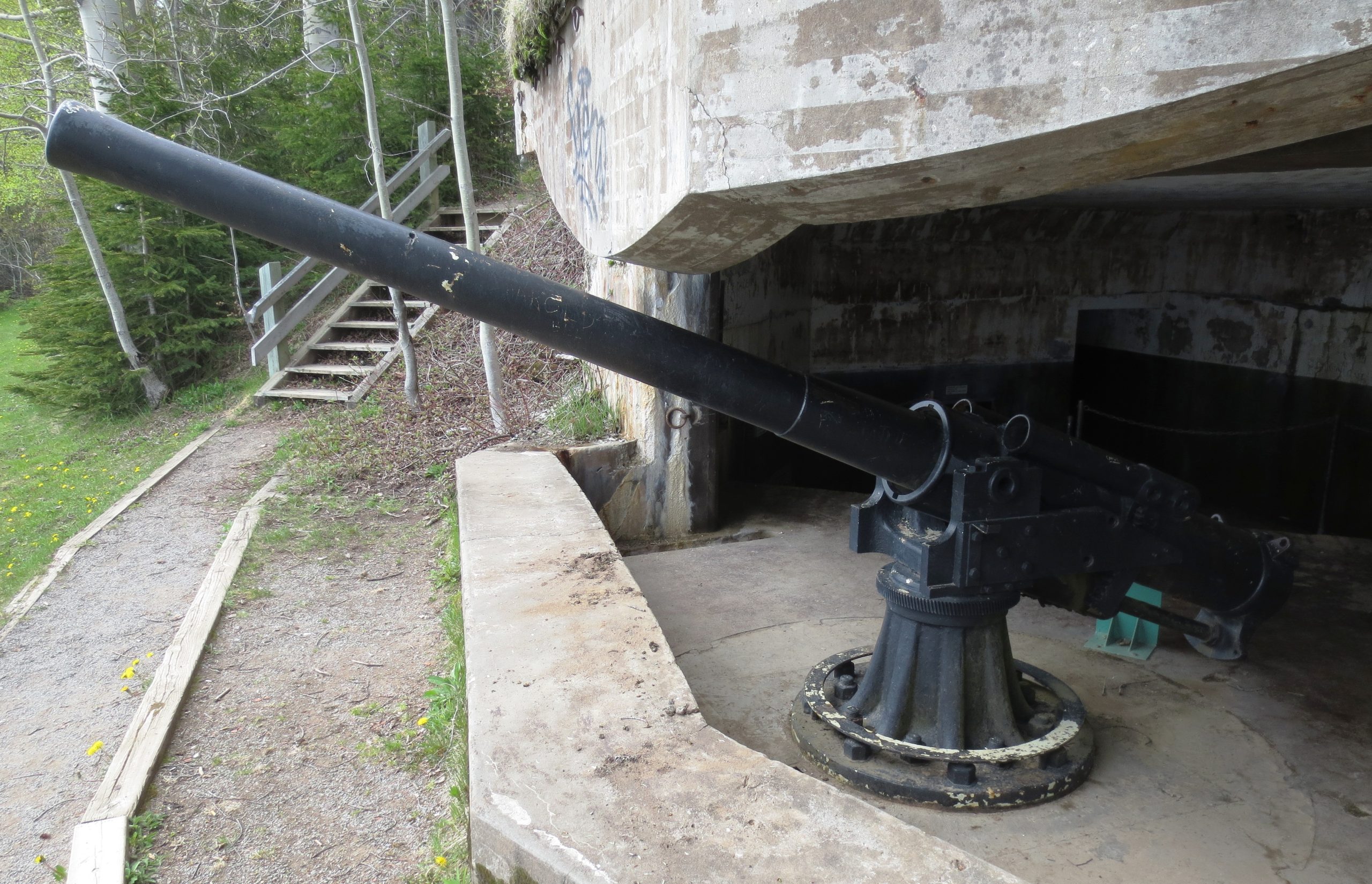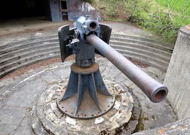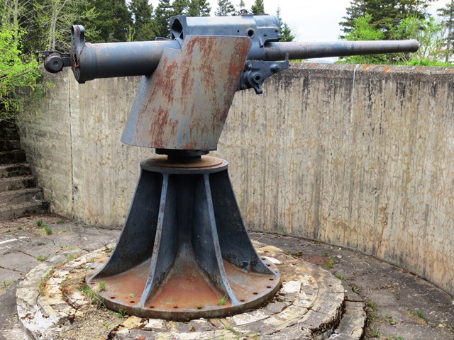 4.7-inch QF Mk. IV* “Star” Gun, RGF 1899, (Serial No. 793) mounted on an iron pivot. No. 3. This gun is mounted upside down with the gun shield mounted in reverse (which would have turned it into a deadly shot trap). Records indicate this gun was originally mounted in a coastal defence position in Saint John, New Brunswick. The No. 1 gun position still exists, but there is no gun or mount in it.