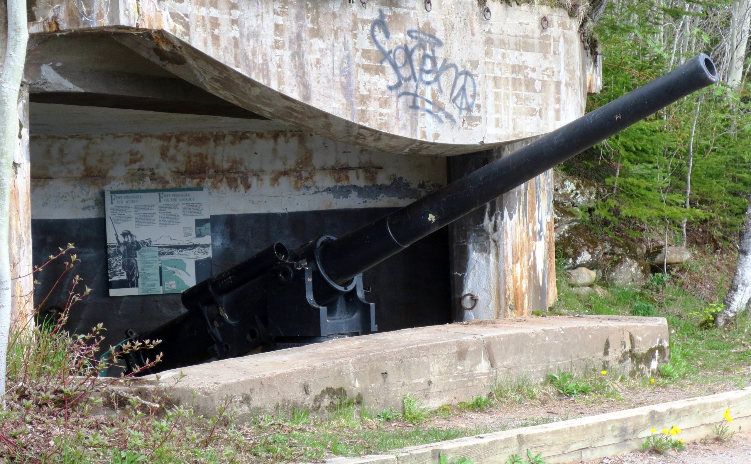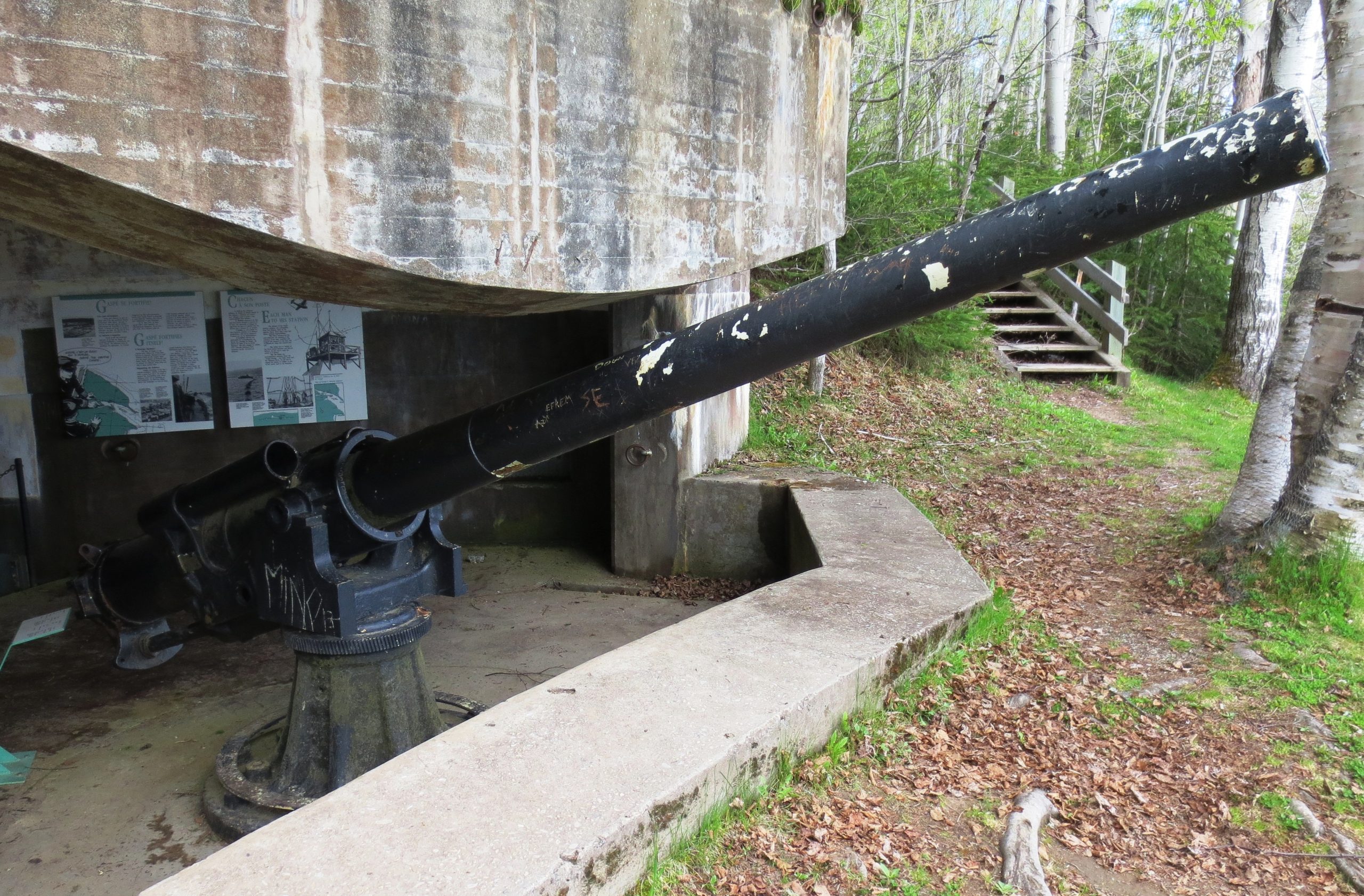 From as early as 1941 German U-boats patrolled the Gulf of St. Lawrence and due to its strategic location fortified gun positions were built at a number of Gaspé sites. These included the Fort Peninsula galleries at the entrance to Forillon National Park, the Fort Ramsay naval base at Sandy Beach, and the shoreline batteries at Cap-aux-Os and Fort- Prével. The Fort Prével gun battery was equipped with two giant guns. Remains of the battery can be viewed on the property of the Auberge Fort Prével located at 2053, boulevard Douglas, (highway 132) Saint-Georges-de-Malbaie.