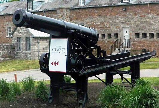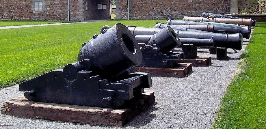 Blomefield 24-livres 50-cwt canon à chargement par la bouche à alésage lisse, monté sur un chariot de garnison en fer.  Ce type particulier d’affût et de platte-forme tout en métal fut utilisé en temps de paix tout au cours du 19 ème siècle. En cas de conflits, les affûts de bois remplaçaient ceux de fer. Bien que moins résistants aux intempéries, les affûts de bois résistaient aux éclatements.