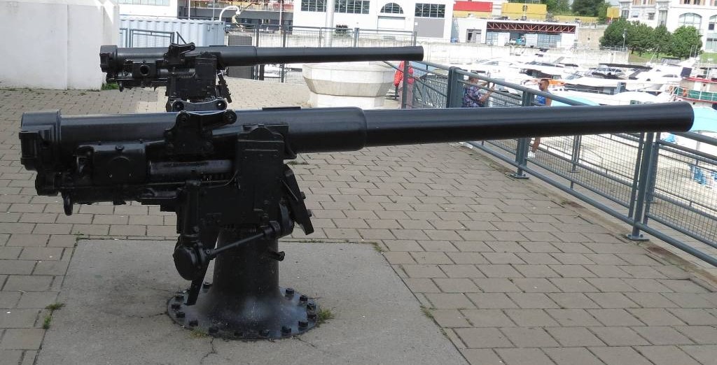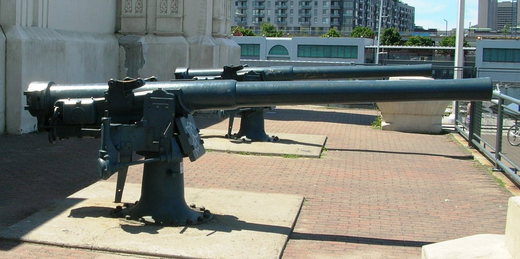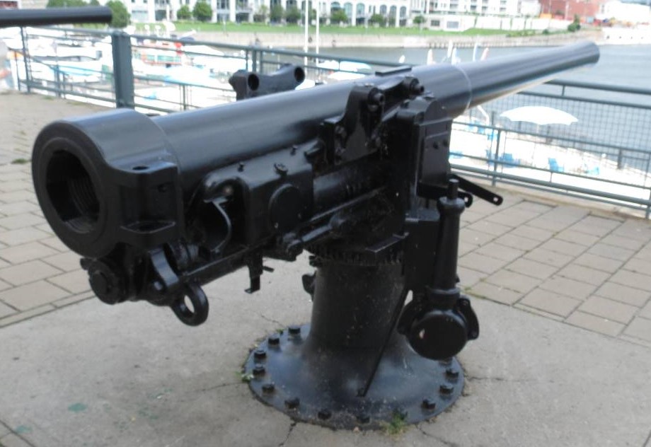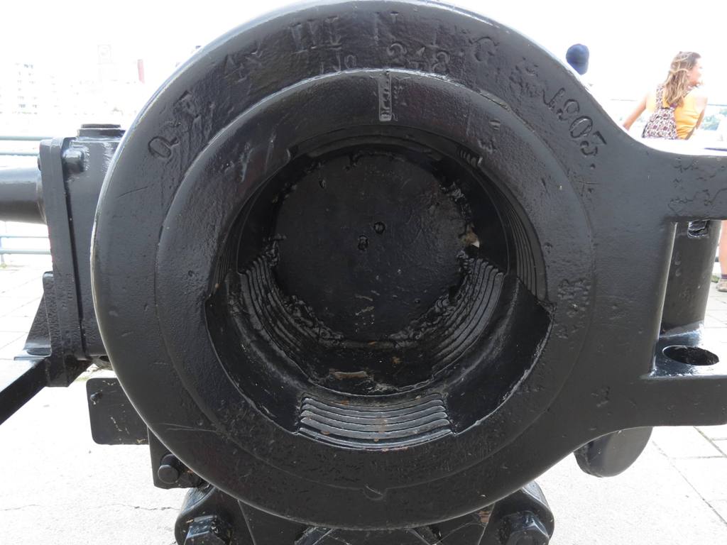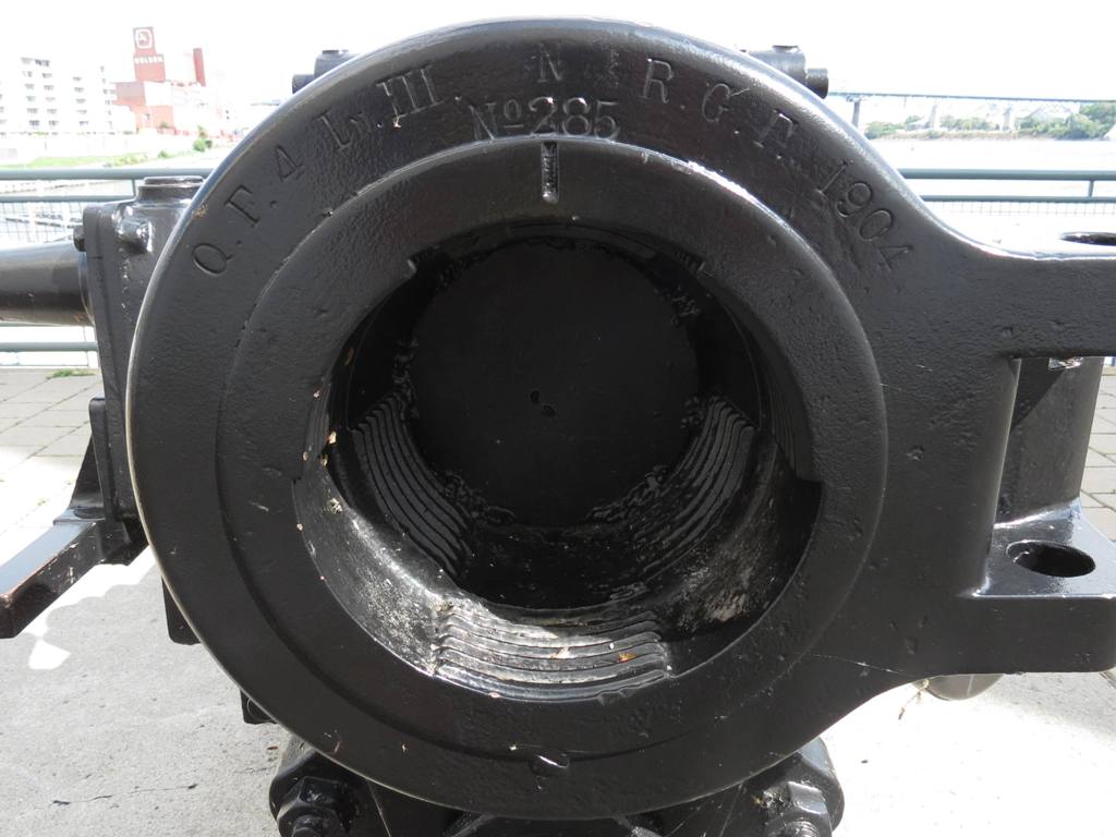 Canon navale de 4 pouces QF Mk. III, monté sur un pivot en fer, n ° 1 à La Tour du Souvenir près de la jetée Alexandra (à l’origine Victoria Pier). Inscription sur la culasse : Q.F. 4 In. III, N, R.G.F., 1904, No 285.
