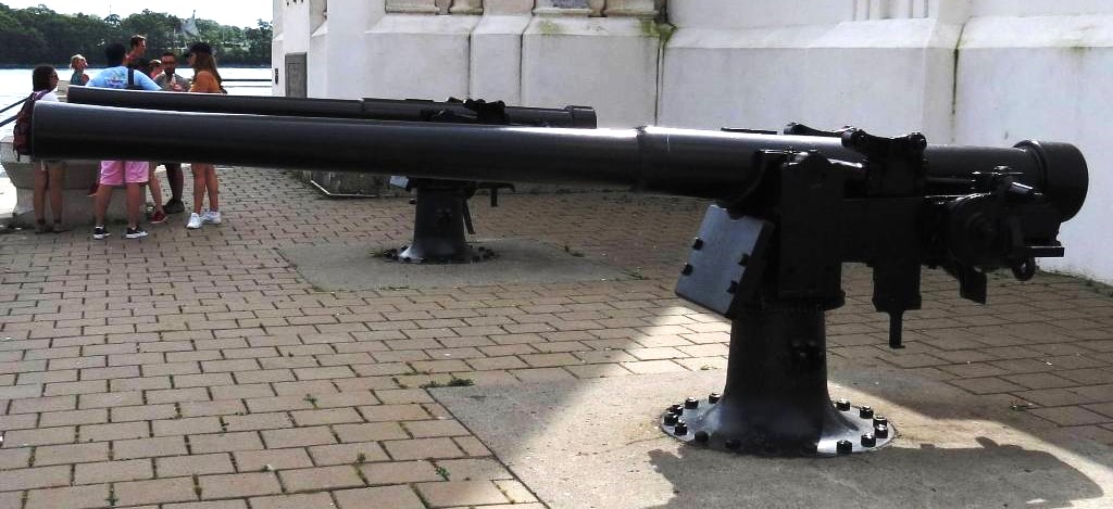 Canon navale de 4 pouces QF Mk. III, monté sur un pivot en fer, n° 2 à La Tour du Souvenir près de la jetée Alexandra (à l’origine Victoria Pier). Inscription sur la culasse : Q.F. 4 In. III, N, R.G.F., 1904, No 242.