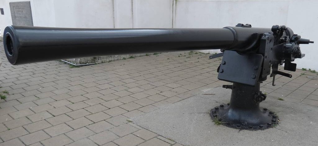 4.-inch QF Mk. III Naval Gun, mounted on an iron pivot, No. 1 at La Tour du Souvenir near Alexandra Pier (Originally Victoria Pier). Inscription on the cascabel : Q.F. 4 In. III, N, R.G.F., 1904, No 285.