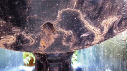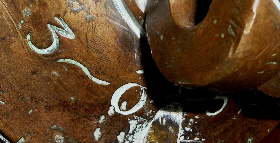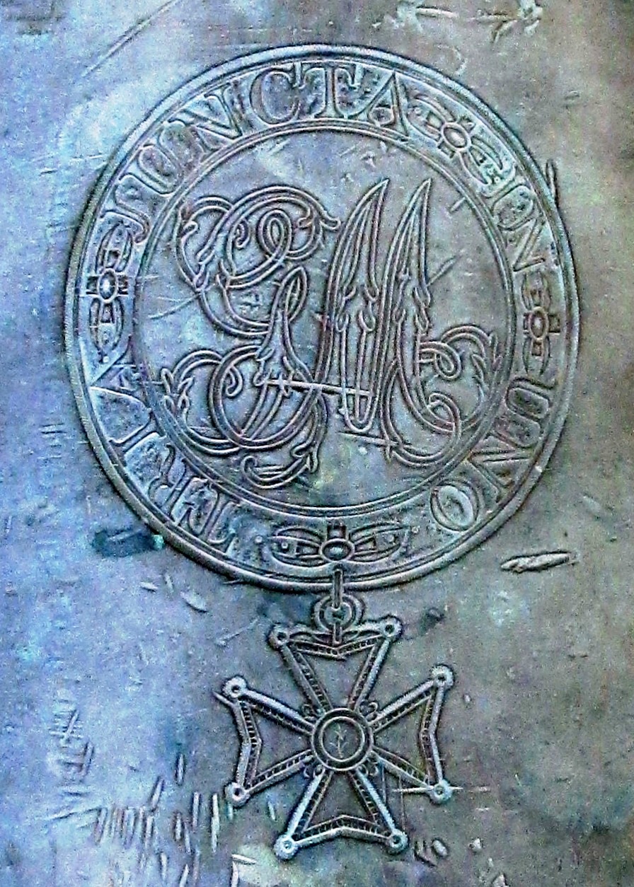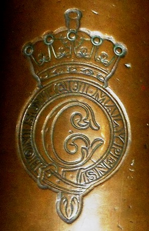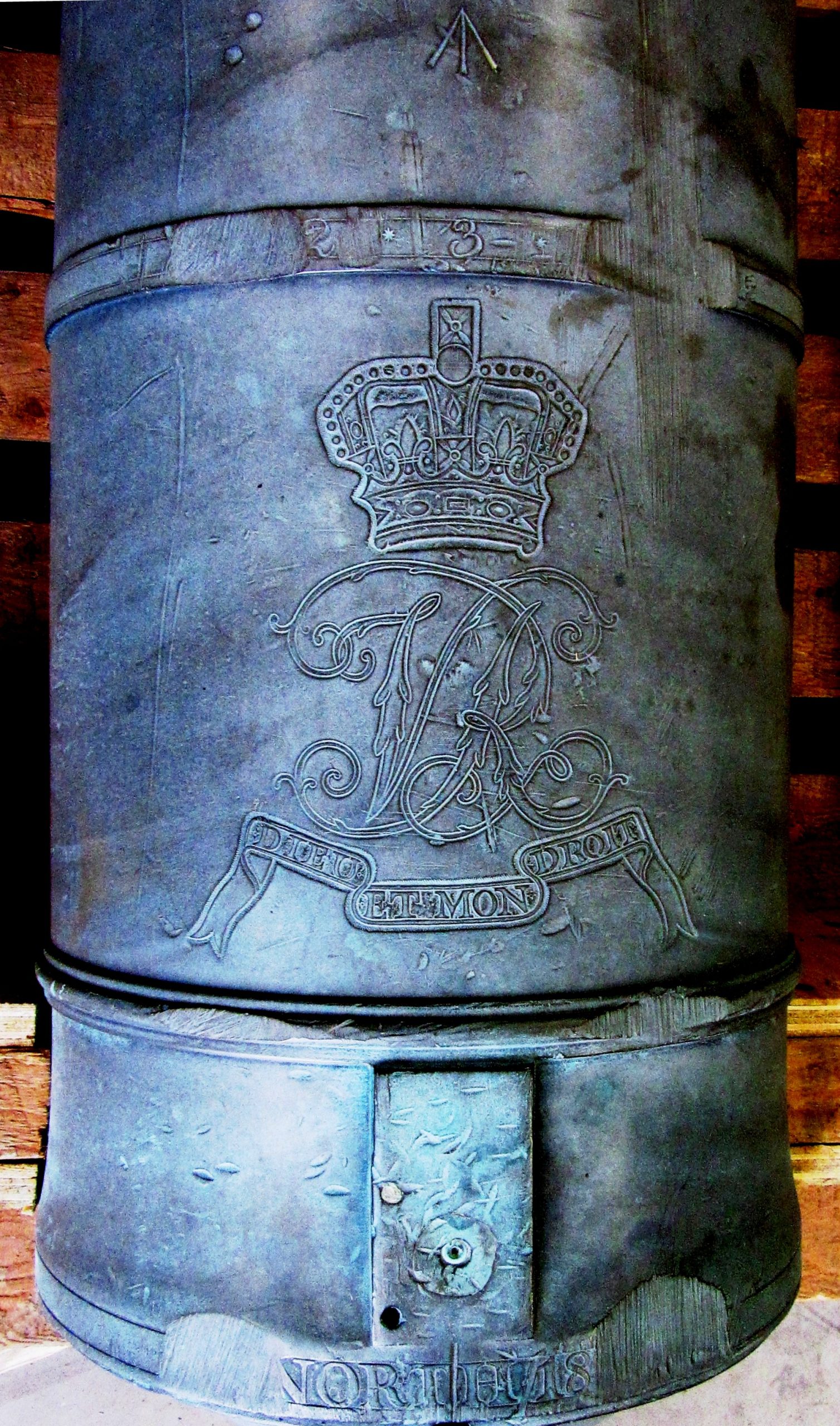 Il est maintenant temps de décrire les marquages de cet obusier ; sur le premier renfort, on peut voir le monogramme de la reine Victoria reposant sur une banderole portant la devise: DIEU ET MON DROIT, le tout surmonté d’une couronne en relief. De plus, un autre monogramme est visible sur la volée : il s’agit d’un G et d’un M stylisés, entourés de la devise de l’ordre du Bain, TRIA JUNCTA IN UNO. Une croix de Malte est suspendue à la partie inférieure de la banderole. Il s’agit vraisemblablement du monogramme de sir George Murray, grandObusier de 24 livres en bronze. maître de l’ordonnance ( Master general of the ordnance , MGO), puisqu’il est courant, depuis le XVIIIème siècle, d’intégrer aux pièces d’artillerie le monogramme de ce fonctionnaire haut gradé. Ce symbole peut parfois être surmonté d’un diadème (coronet), si le personnage en question possède un titre de noblesse, ce qui ne semble pas être la cas ici. Sir George Murray occupa le poste de grand-maître à deux reprises : de décembre 1834 à mai 1835, puis de septembre 1841 à juillet 1846. La présence de sa « signature » sur cet obusier, en conjonction avec le monogramme de la reine Victoria nous indique qu’il a été coulé au cours de sa seconde période en fonction, de même que la devise de l’ordre du Bain signifie aussi l’appartenance de Sir George Murray à cet ordre de chevalerie, fondé par le roi George Ier. On voit aussi la flèche de l’ordonnance sur le second renfort. D’autres marquages furent impossibles à interpréter : le premier, NORTH 18, est visible sur le bourrelet de culasse ; le second, arborant les chiffres 2 et 3 séparés chacun par une petite étoile, apparaissent sur la ceinture séparant le premier et le second renfort. En terminant, nous ne pouvons passer sous silence la rareté de telles bouches à feu en bronze, ce qui rend leur conservation d’autant plus importante. Par exemple, sur les 169 pièces d’artillerie dans l’ensemble des lieux et Parcs historiques nationaux gérés par Parcs Canada, il n’existe en tout et pour tout que 10 canons et deux mortiers de bronze.