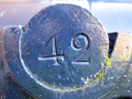 Le tube de l’obusier lui-même porte peu de marquages, soit simplement la flèche de l’ordonnance britannique sur le dessus de la culasse 1 , la lettre « L » sur le tourillon droit, et « 42 » sur le gauche, cette indication marquant peut-être l’année de coulage de la pièce, soit 1842. L’obusier repose sur son affût d’origine , marqué 24 Pr HOWr (24 pounder howitzer) C&H (sans doute les initiales du fondeur) , ainsi que le poids, 15-2-0. Ces derniers 1 Pour la terminologie des diverses parties, voir le dessin à la fin