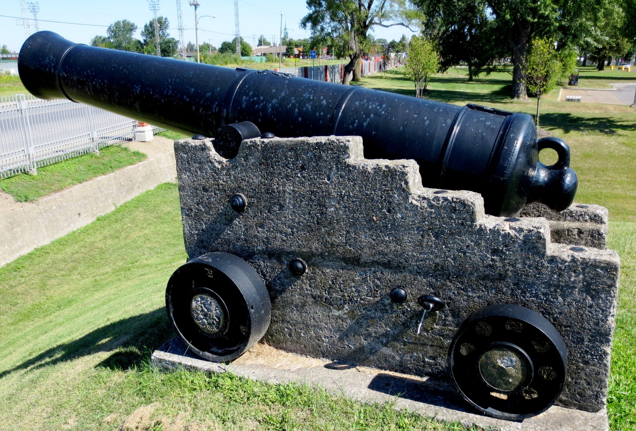Canon en bronze de 24 livres 18 cwt à canon lisse à chargement par la bouche, les marques ont peut-être été partiellement effacées lors de sa pose dans la rivière Richelieu. Le canon a été récemment monté sur un chariot en bois à roues. Monogramme du chiffre de George Murray et de la reine Victoria.