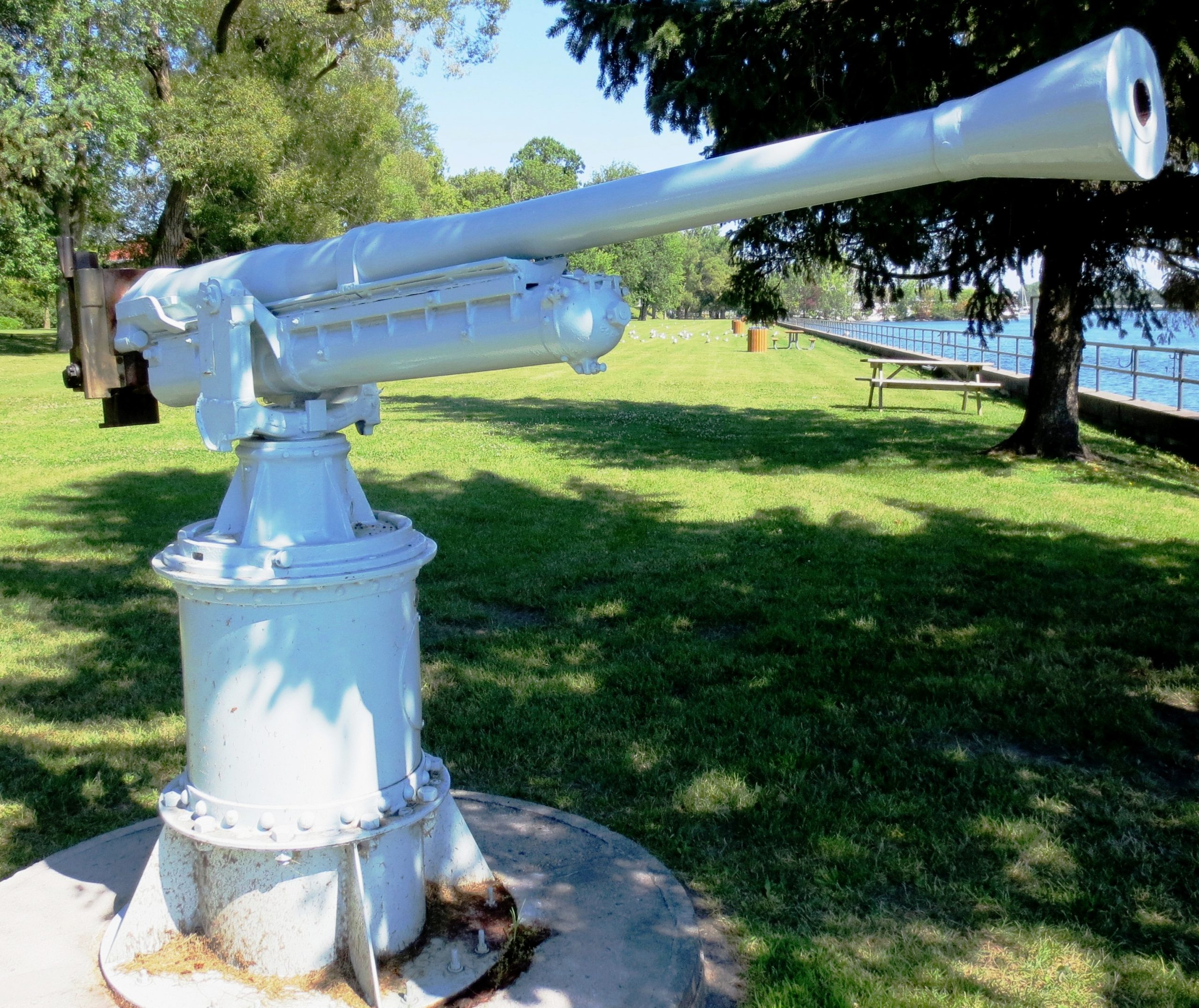 Canadian Vickers de Montréal BL 6-pounder saluting gun from HMCS MacKenzie, mounted on an iron deck stand facing the river. B/R No. L/17117, T G – 1966.
