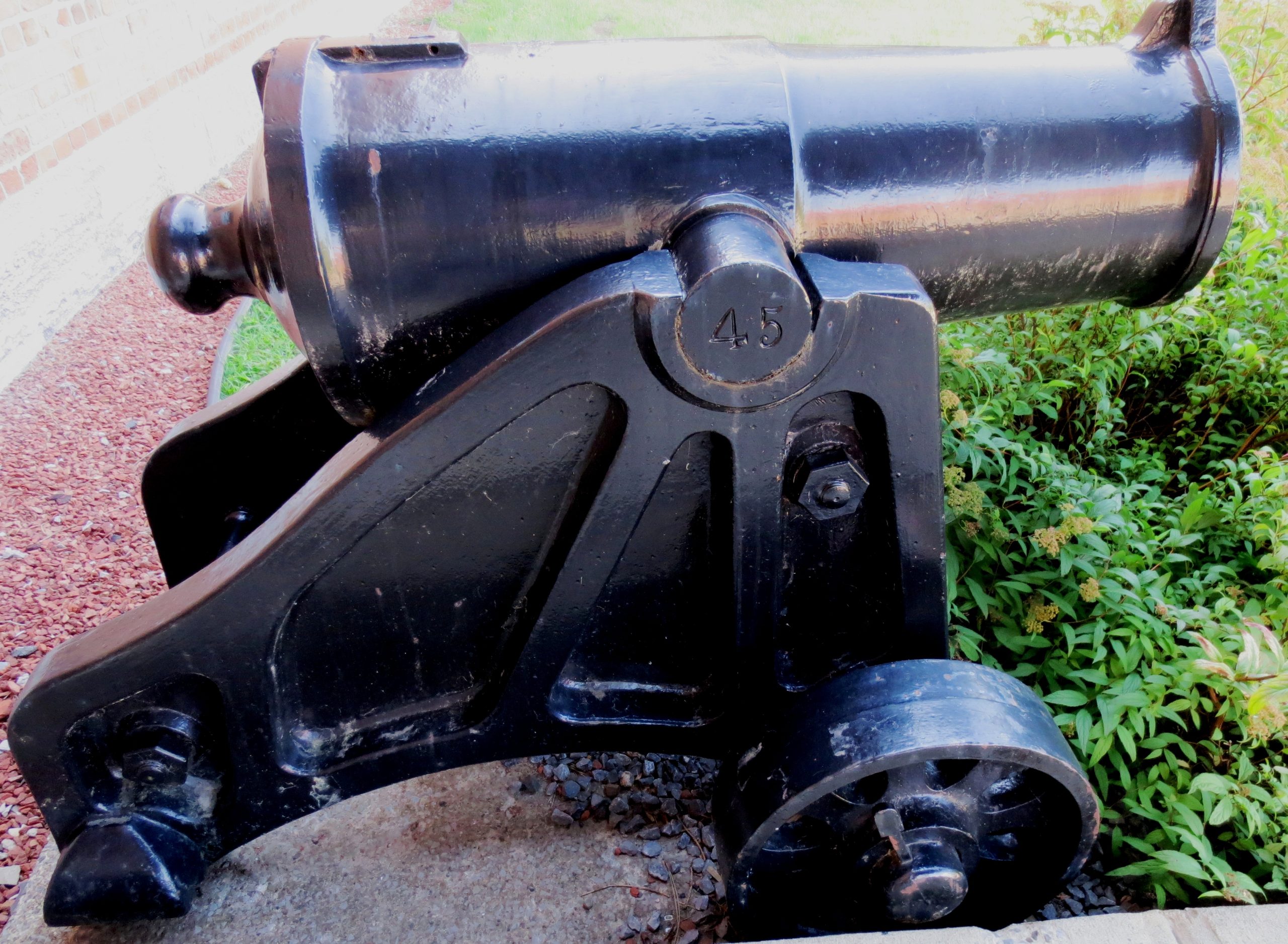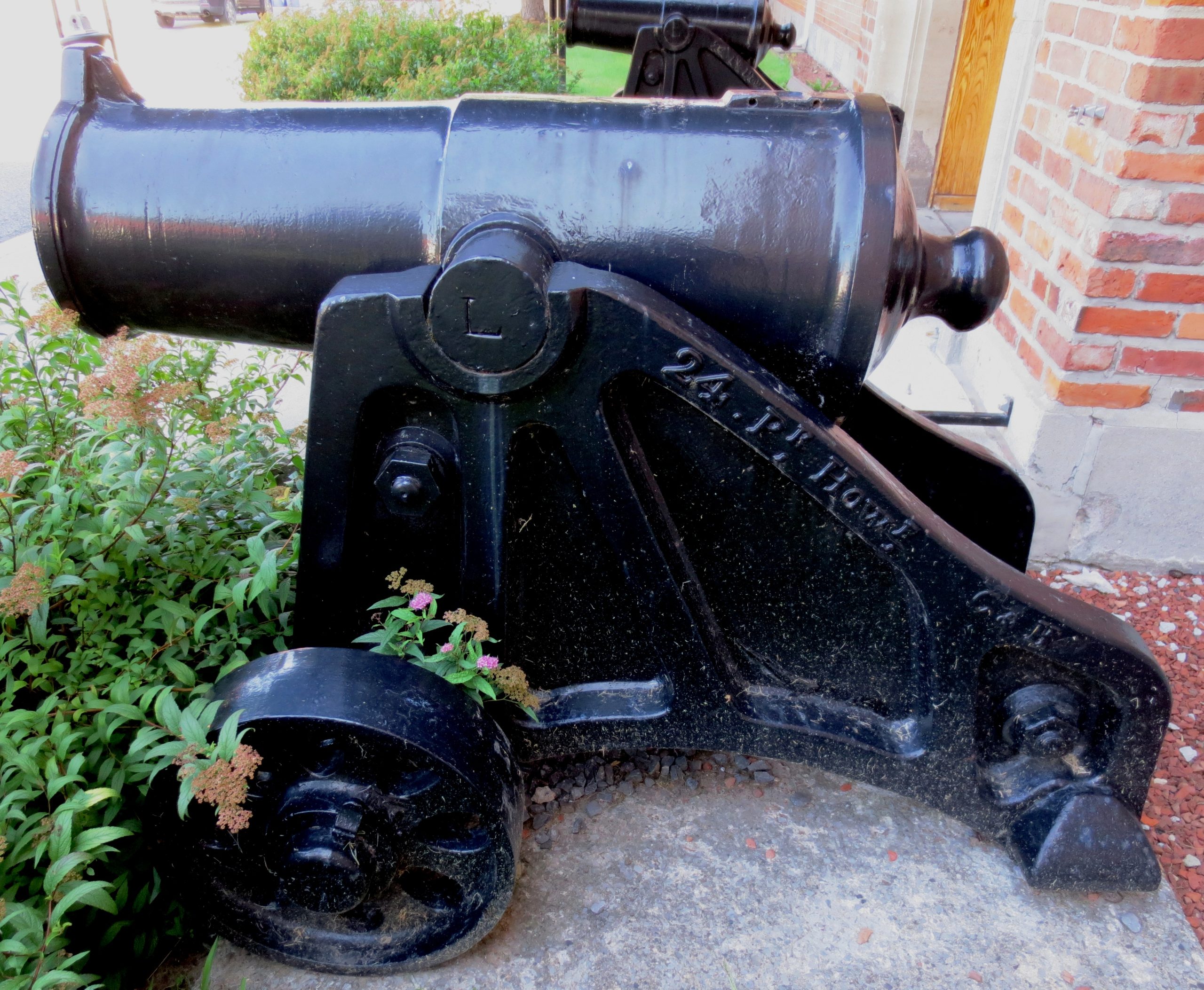 Cast Iron 24-pounder 15-cwt Smoothbore Muzzleloading Howitzer, weight 15-0-26 (1,706 lbs), (L) on the left trunnion, (Serial No. 45) on the right trunnion, mounted on an iron garrison carriage. No. 2 of 2 in front of the Officer’s Mess.