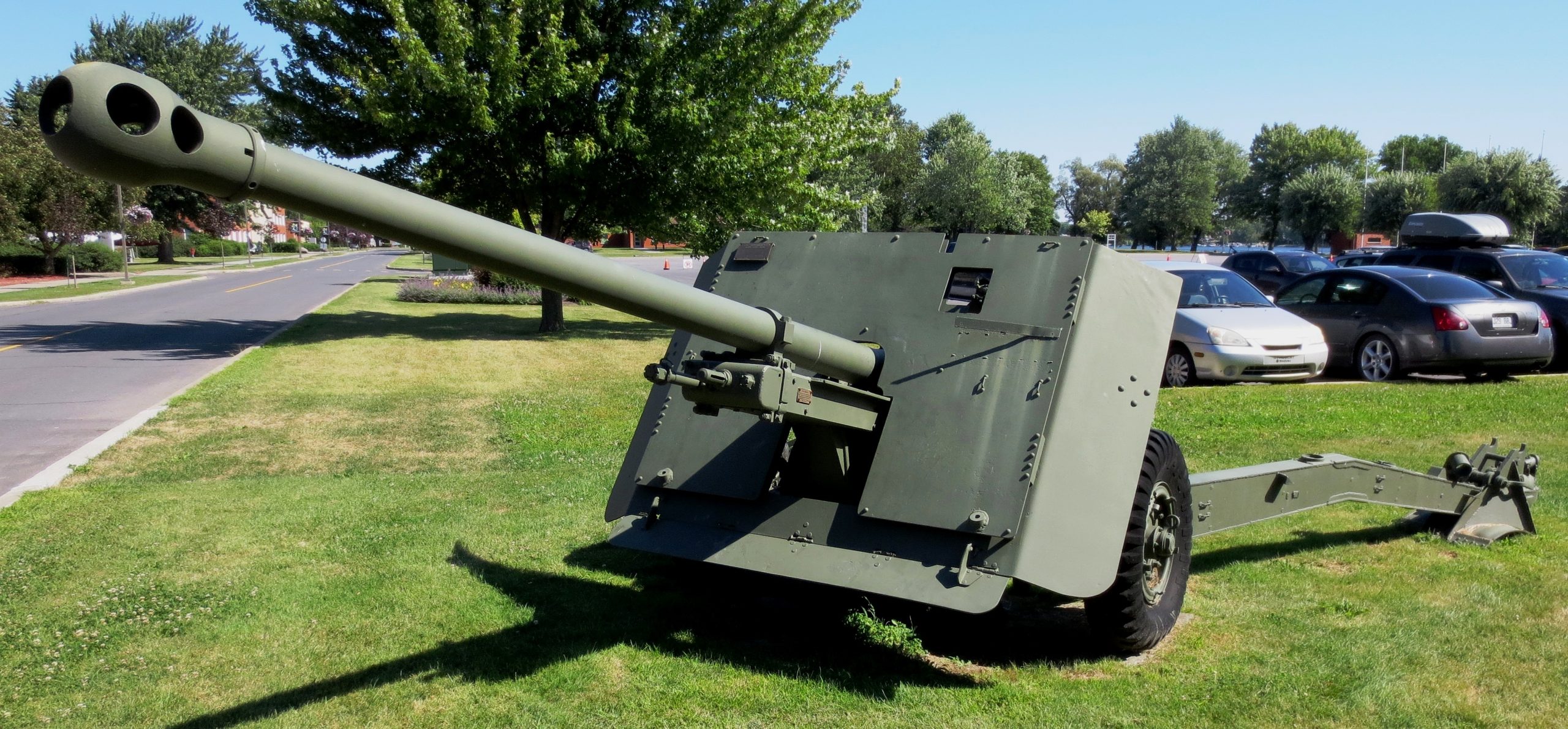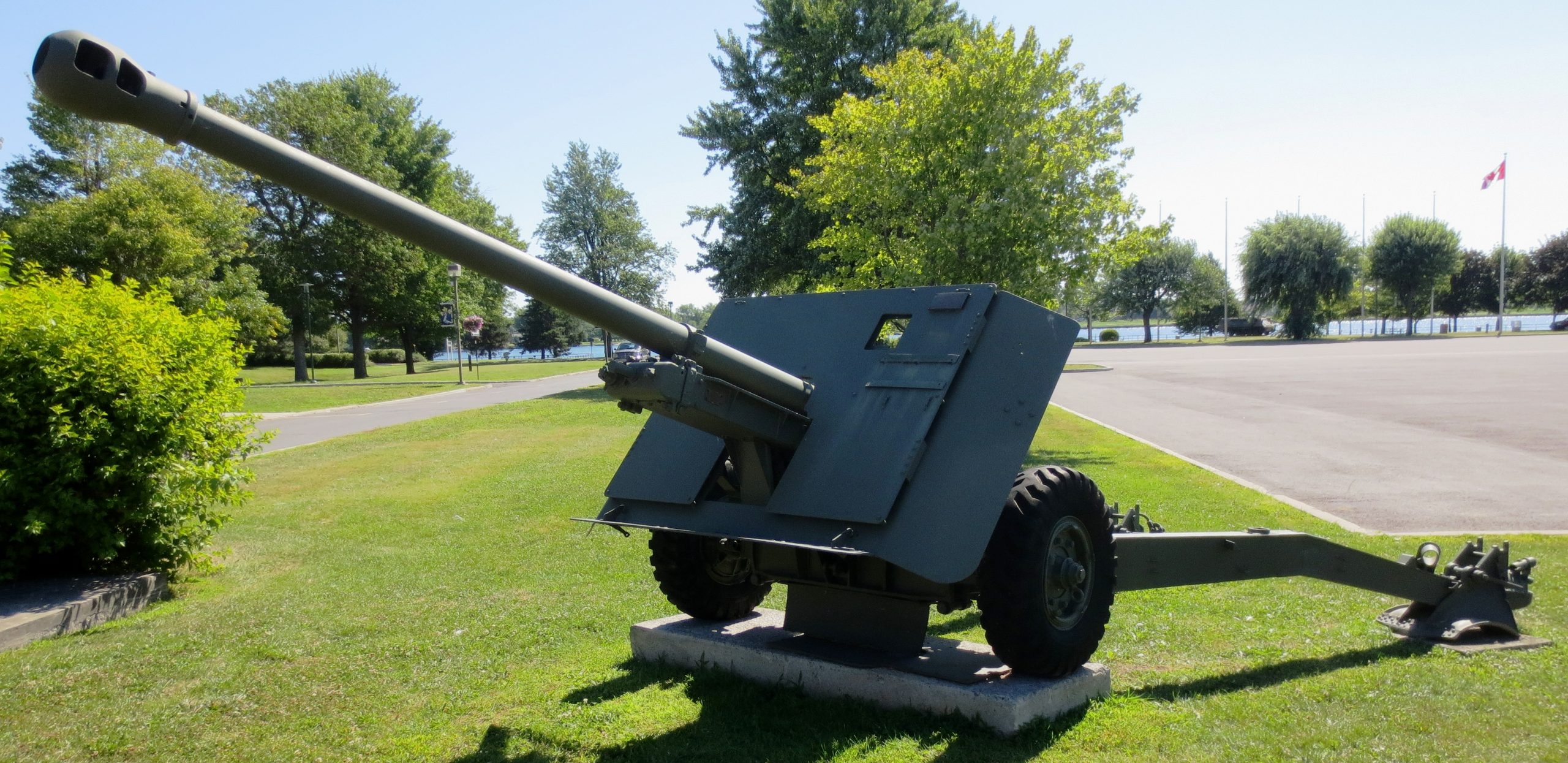 Ce canon britannique sortit de chaînes d’assemblages en 1942 et faisait suite à la prise de conscience par l’armée britannique que les blindés allemands étaient devenus de plus en plus protégés. Comme on manquait d’affûts pour les utiliser, certains furent montés sur des affûts de canons de campagne de 25 livres, avant que la production de l’équipement requis fut au point. Leur désignation temporaire était à ce moment « Ordnance QF 17/25, mais leur véritable appellation était « Ordnance, QF de 17 livres ». C’était une arme de 76,2 mm de calibre, assez lourde, mais à profil bas et pouvant soutenir une cadence de tir importante si besoin était. Ce canon représentaint l’une des armes antichar les plus puissantes dont disposaient les Alliés durant la Deuxième Guerre Mondiale, et la plupart des armées l’utilisèrent. L’exemplaire du Fort Saint-Jean porte une plaque avec l’inscription : « Canon antichar britannique calibre 17 livres 76,2mm). Nous ignorons à quelle période ces canons cessèrent d’être employés, mais le développement rapide des missiles antichar en a certainement rendu l’usage moins fréquent à partir des années 1960.