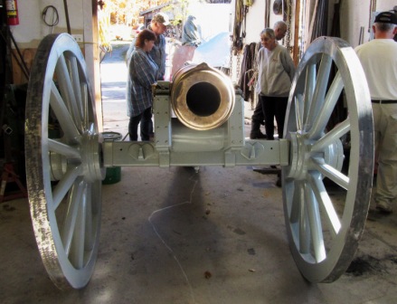 Obusiers de fonte de 24 livres. Il est identique au premier décrit, sauf en ce qui concerne le chiffre « 45 » sur le tourillon droit, et le poids indiqué sur l’affût, indiqué par les chiffres 15-0-26. Ce dernier doit donc peser 1706 livres, soit un peu plus que son voisin de droit. N ° 2 sur 2 devant le mess des officiers.