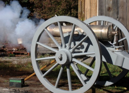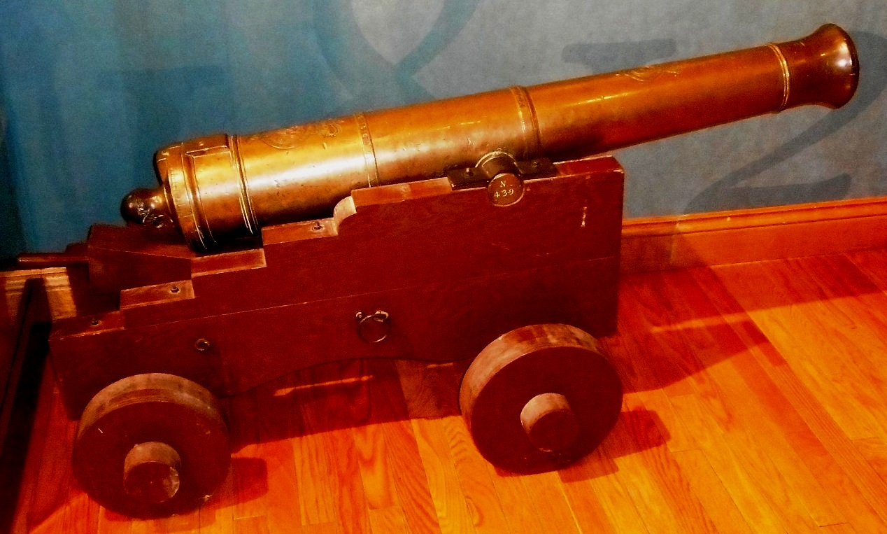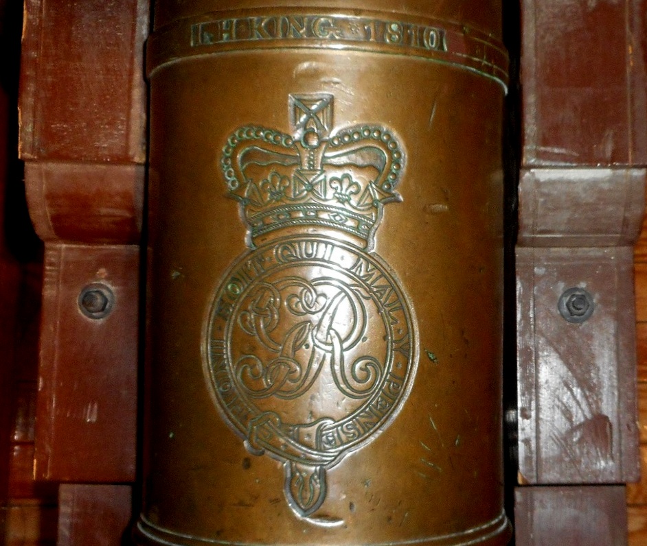 Canon de 3 livres en bronze. Ce canon, placé à l’intérieur du musée, possède un calibre de ± 2,95 pouces (7,5 cm), correspondant à la pièce britannique de trois livres en bronze, dont le calibre original faisant 2,91 pouces pour être légèrement augmenté à 2,95 pouces vers 1845. Plusieurs versions de cette arme virent le jour entre 1720 et 1859, et certains modèles étaient encore en service en 1881. Le canon du musée porte la marque des fondeurs John et Henry King et la date 1810 sur la ceinture du premier renfort (I & H King 1810), ainsi que les chiffres romains CCCCXXXI sur la ceinture du second renfort. On peut aussi voir sur le premier renfort le monogramme royal de George III couronné et entouré du symbole de la jarretière, renfermant l’inscription HONNI SOIT QUI MAL Y PENSE. Quant à la volée, elle est frappée d’un autre monogramme, cette fois avec la lettre C, et toujours entouré du symbole de la jarretière et de la devise HONNI SOIT QUI MAL Y PENSE.