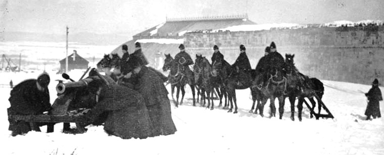 La Citadelle de Québec, winter gun drill with horse-drawn sled, 1885.