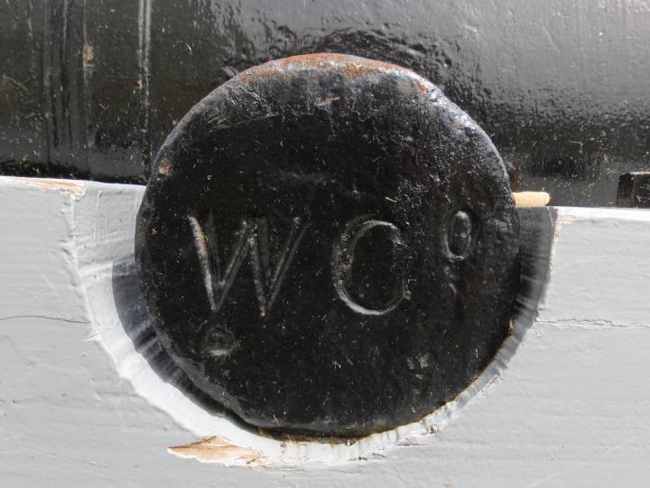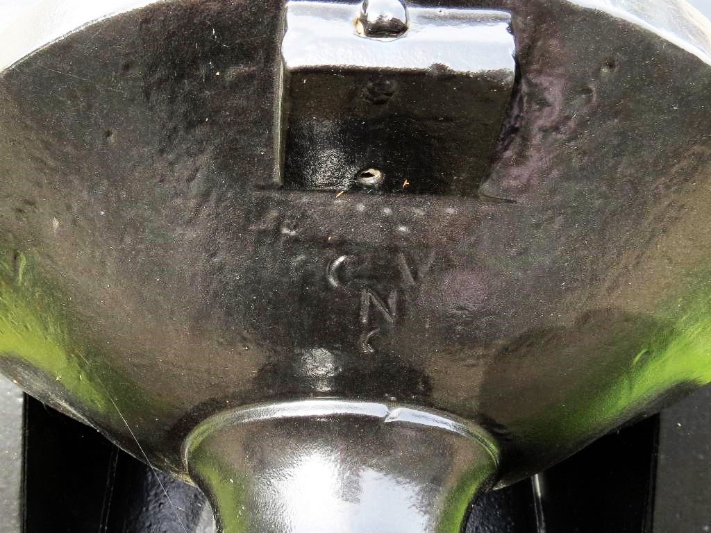 Canon à chargement par la bouche rayé Palliser converti de 80 livres, 5 tonnes (n ° de série 1776, 1867) (RGF n ° 109, I, 1869) sur le tourillon gauche. Poids de tourillon marqué 11,228 lbs, prépondérance 1,417 lbs. Sir W.G.Armstrong & Co. (WCo) sur le tourillon droit. CV, C. La bouche du canon est marquée C.N. 1648. Ce canon a été converti à partir d’un canon à alésage lisse de 68 livres et 95 cwt et est monté sur un chariot traversant en fer de 7 pouces et 7 tonnes. Étiquette de musée 90-989-1. 1860.