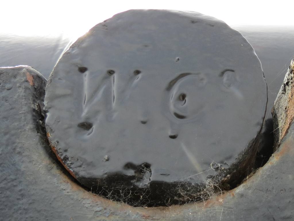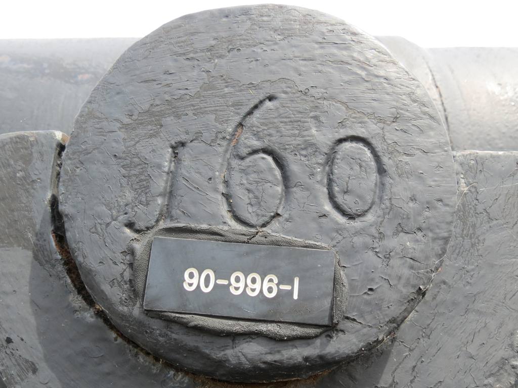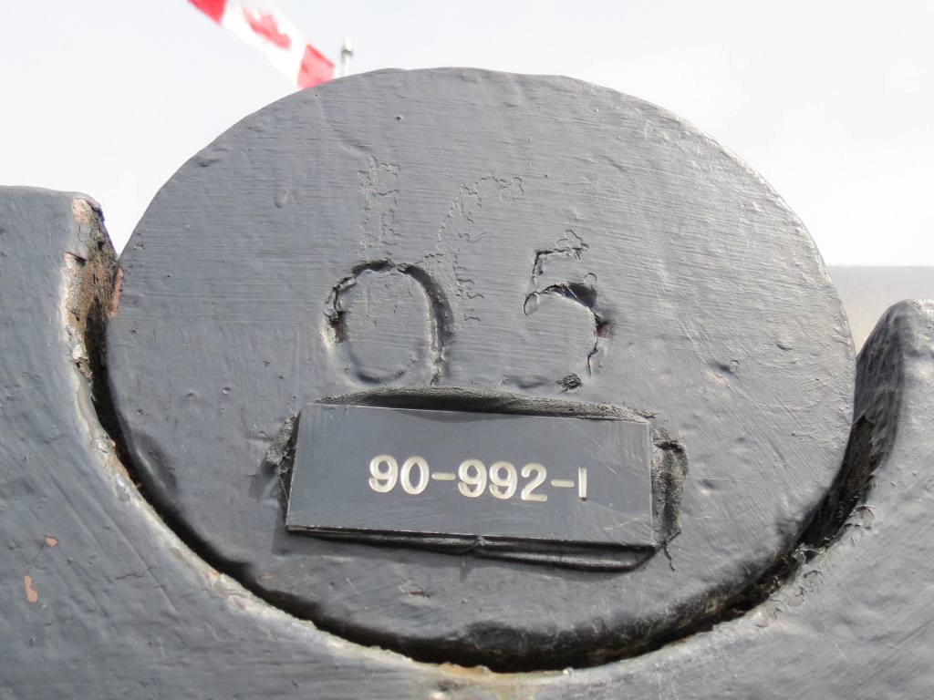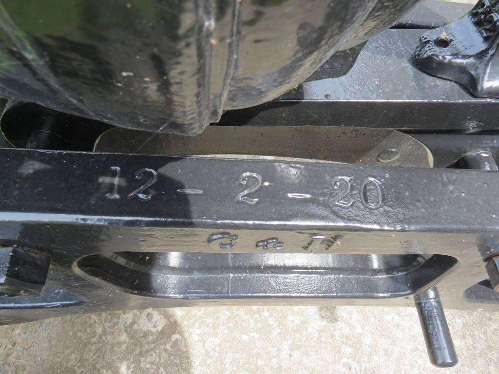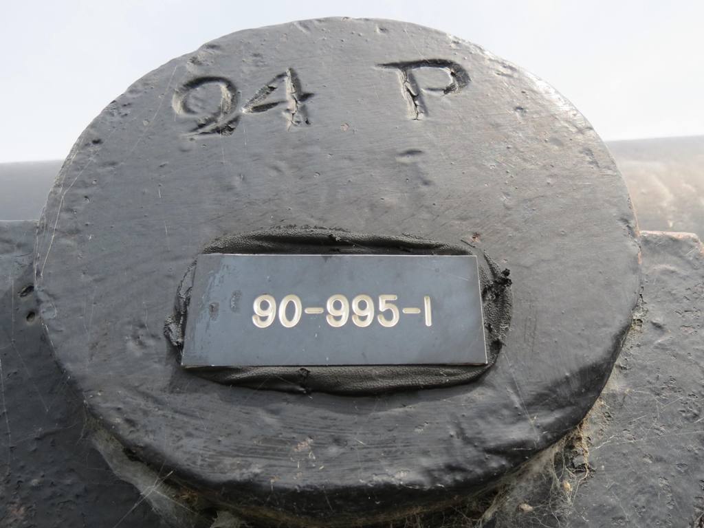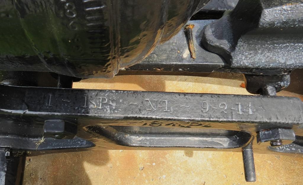 Carabine Mk II 9 pouces 12 tonnes, poids 12-11-1-0, (12 X 2,240 lbs = 26880 lbs) + (11 X 112 lbs = 1232 lbs) + 28 lbs = 28140 lbs, montée sur un fer traversant le chariot de canon, MDN 4G-48, no 587, Musée no 86-10-1. Pos. no 1 de 5. Chariot traversant en fer.