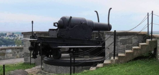 There are seven Blomefield Cast Iron 24-pounder 50-cwt Smoothbore Muzzleloading Guns, weight unknown (>5,000 lbs), mounted on iron garrison 24-pounder gun carriages, aligned in a row on the ramparts of the NW corner of the Citadel. (A few of these guns have changed position).